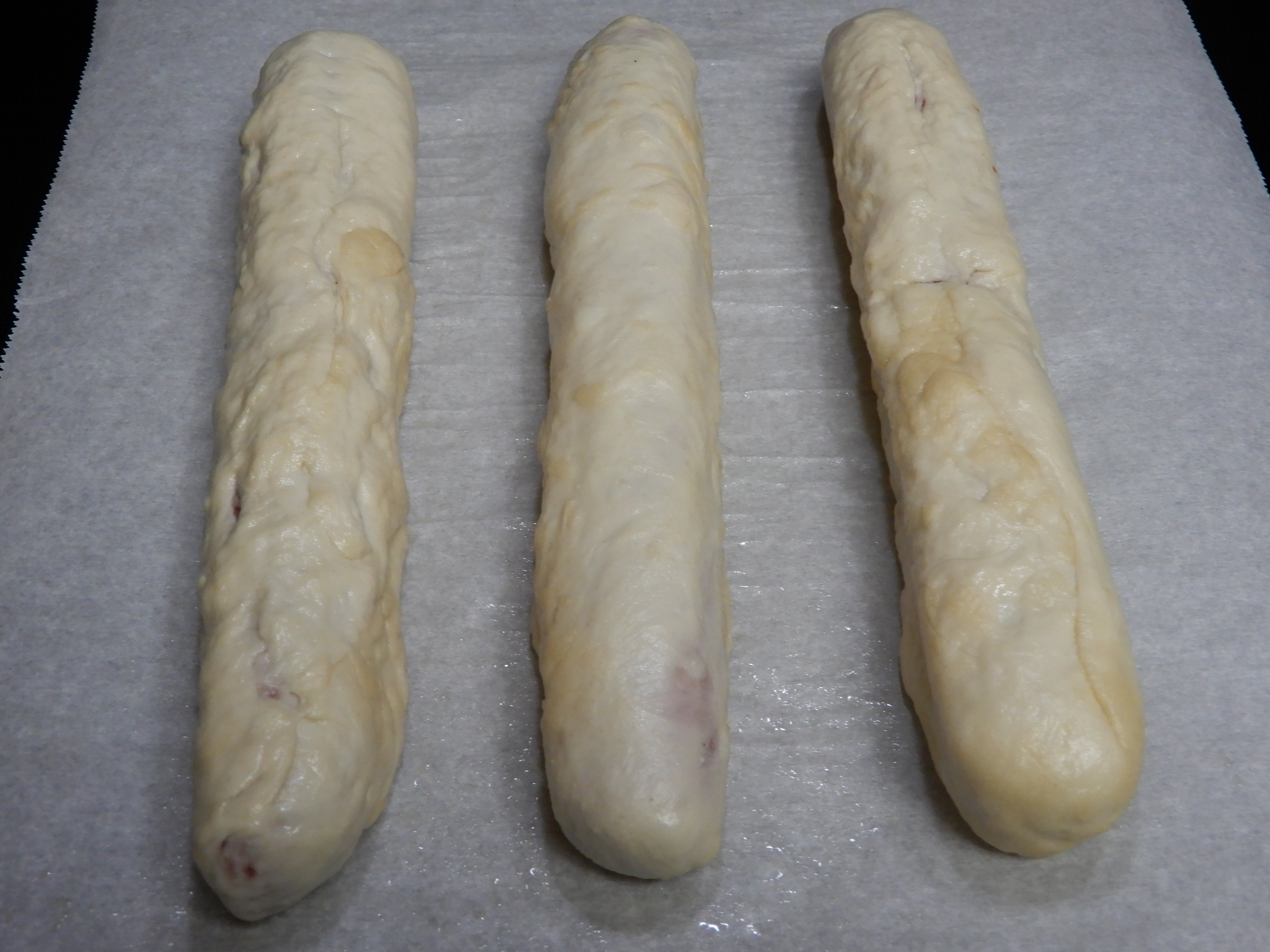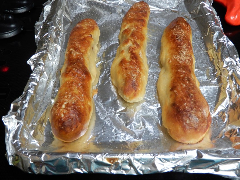 My attempt at Pretzel Dogs for a Wild Card Wednesday was one of them, although it wasn’t the biggest mistake ever made. What I did wrong was to use Costco All-Beef Dinner Franks. These things are huge. I do mean huge. One look at the dog and I knew the recipe needed to be adjusted – one frozen Parker House Dinner Roll per hot dog wasn’t going to do it. Using 2 rolls presented another problem – you were suppose to create a bread “rope”and then coil it around the dog. First there was the issue of getting two rolls to stick together in one rope, and second was to coil anything around a hot dog that big.