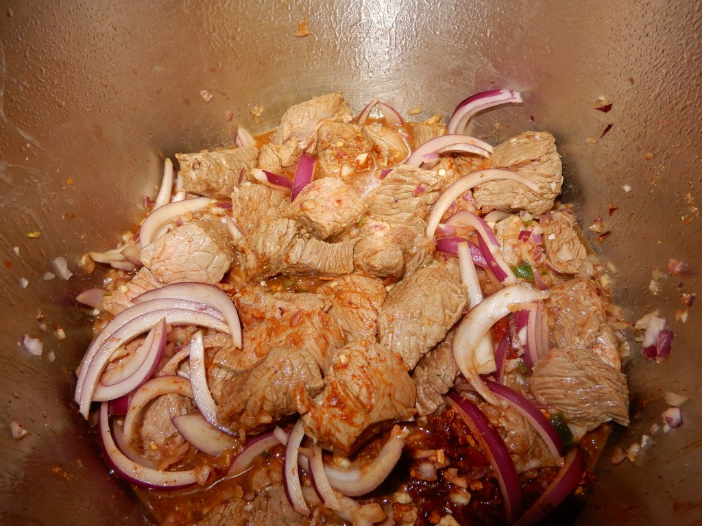 Peel 1 red onion, cut in half. Mince half of the onion, slice remaining half into slivers, set aside. Finely chop chipotle chilies, set aside. Peel and finely mince garlic, set aside. Stem and finely mince 4 jalapeno pepper, set aside.