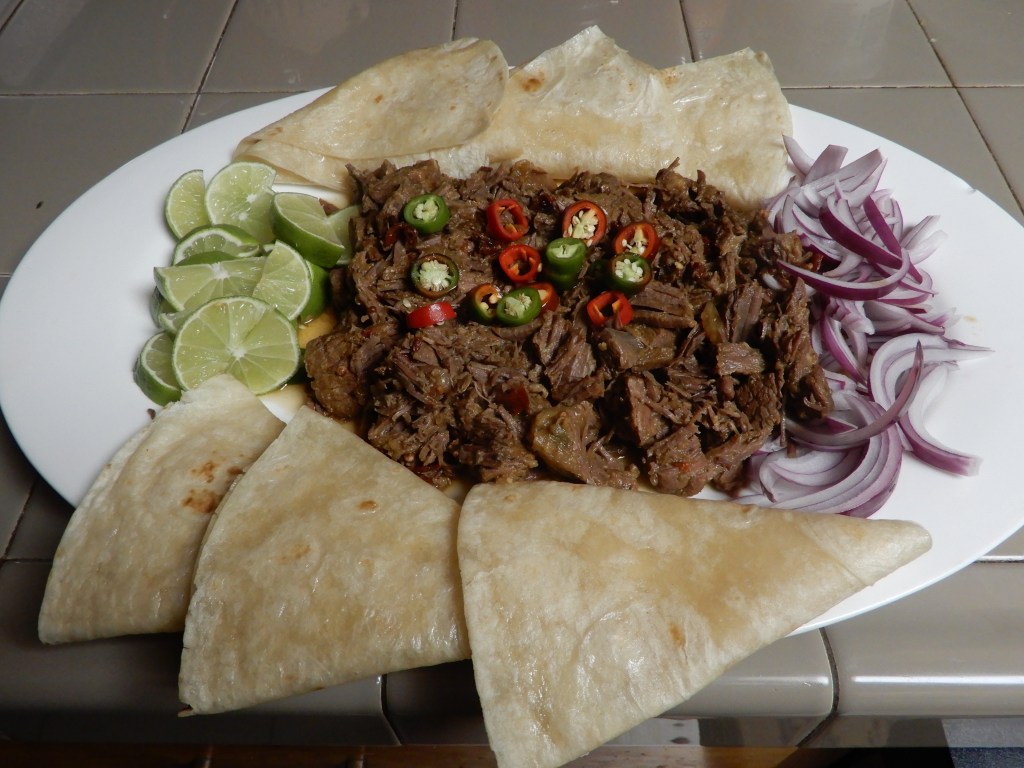 Spread Barbacoa in the center of a serving platter. Place limes at one end, red onions at the other end of the platter. Drape folded tortillas around the edge of the platter. Garnish the meat with sliced peppers as desired. Serve with sour cream on the side.