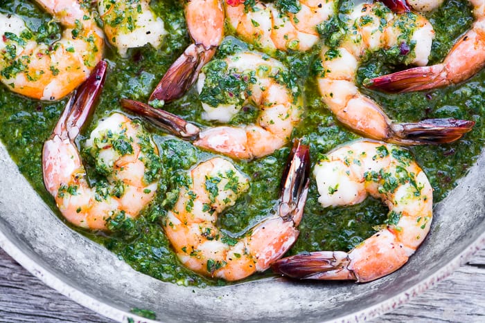 Spread almost all of the chimichurri sauce in a large shallow dish and nestle the cooked shrimp down into the sauce. Drizzle with remaining sauce.