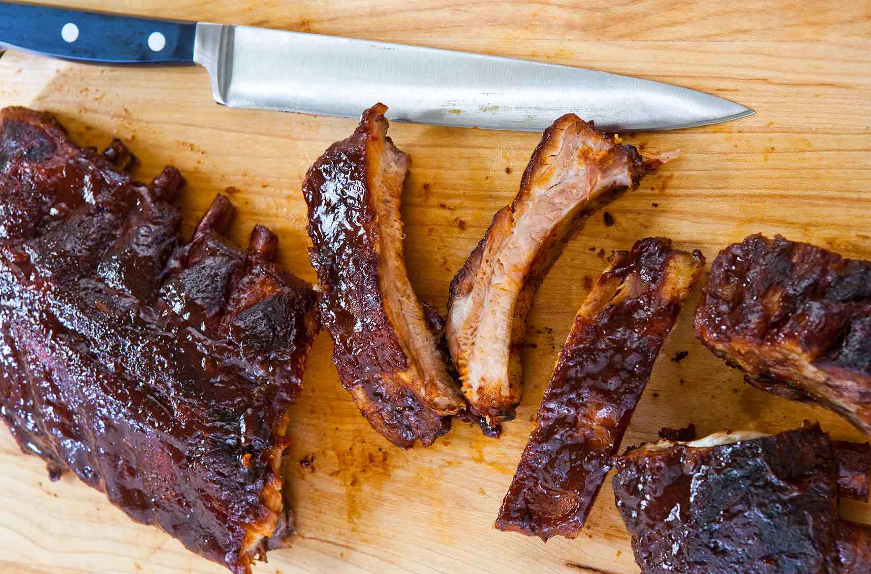 Remove ribs from slow cooker and arrange on prepared pan. Skim fat from the cooking juices and discard. Using a clean brush, brush ribs generously with the skimmed cooking juices.