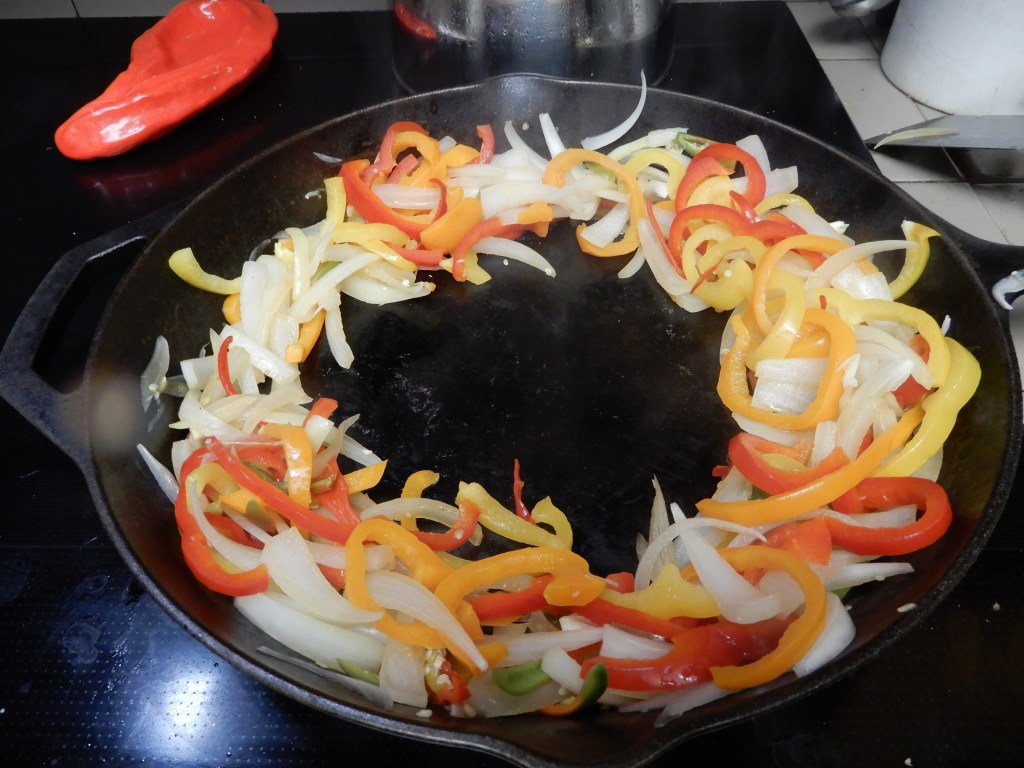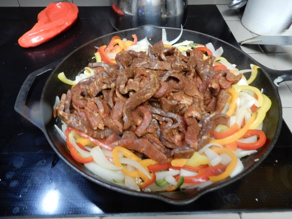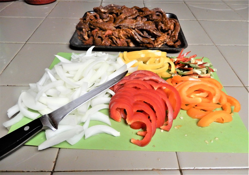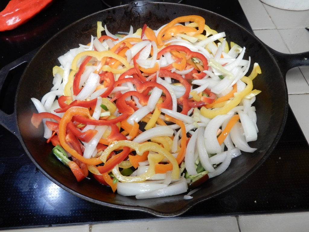 Cut Fajita meat against the grain into thin strips. Set aside. Stem, core and slice all the peppers into thin strips, set aside. Peel onion, cut in half, then into thin slivers, set aside.