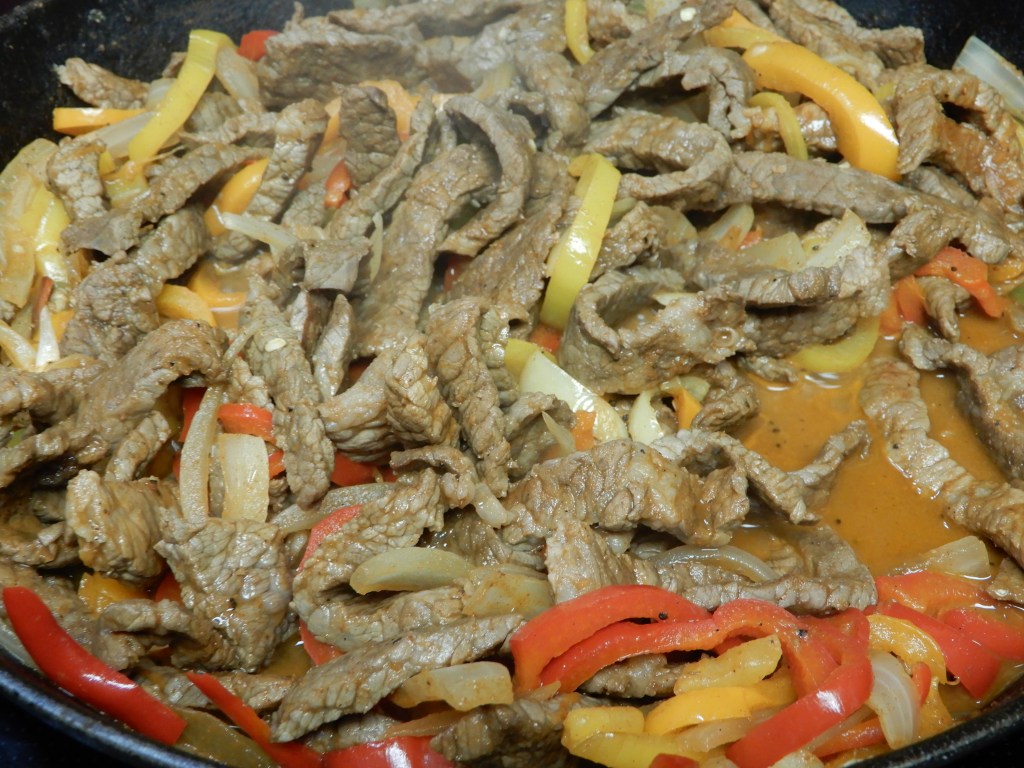 When the vegetables are tender, press them against the edge of the pan, creating a large opening in the center. Fill with steak. Let sizzle a few minutes, stir to blend with the vegetables.