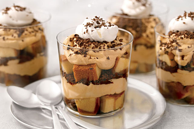 Place half the cake cubes in 10 parfait glasses; drizzle with half the coffee mixture. Cover with half the cream cheese mixture, then 1/3 of the grated chocolate. Repeat layers.