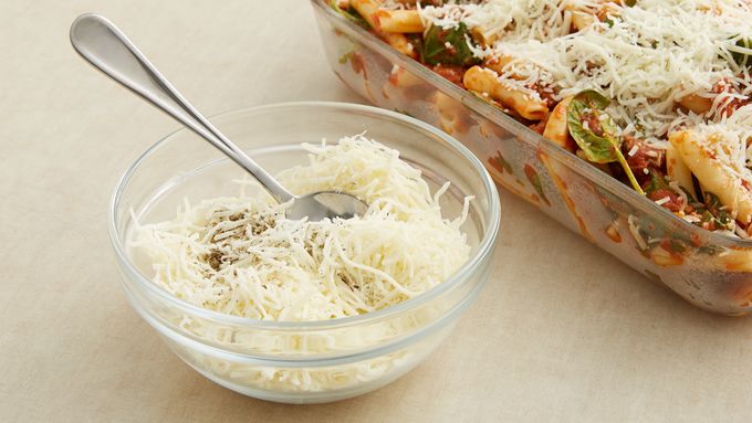 Meanwhile, in a large skillet, cook ground beef and Italian Sausage together, seasoned with 1 teaspoon of the Italian seasoning and the salt. Brown meats over medium-high heat 5 to 7 minutes, stirring occasionally, until no longer pink; drain. Stir pasta, marinara and into beef mixture. Trim any stems from the spinach, leaving only the tender parts of the leaves. Scatter spinach over the pasta mixture and fold gently until well blended. Spoon into baking dish. Sprinkle with 1 cup of the cheese. Set aside.