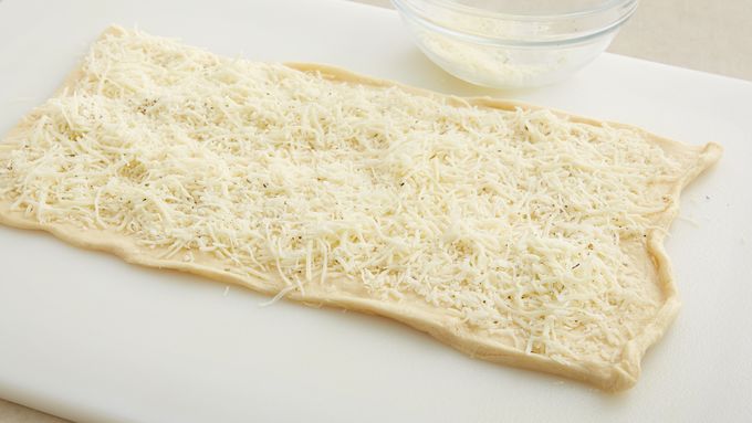 Unroll dough. Sprinkle cheese mixture evenly over dough; press into dough.