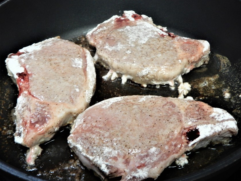 Dredge pork chops in the seasoned flour, shaking off excess coating.