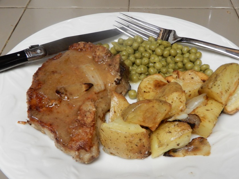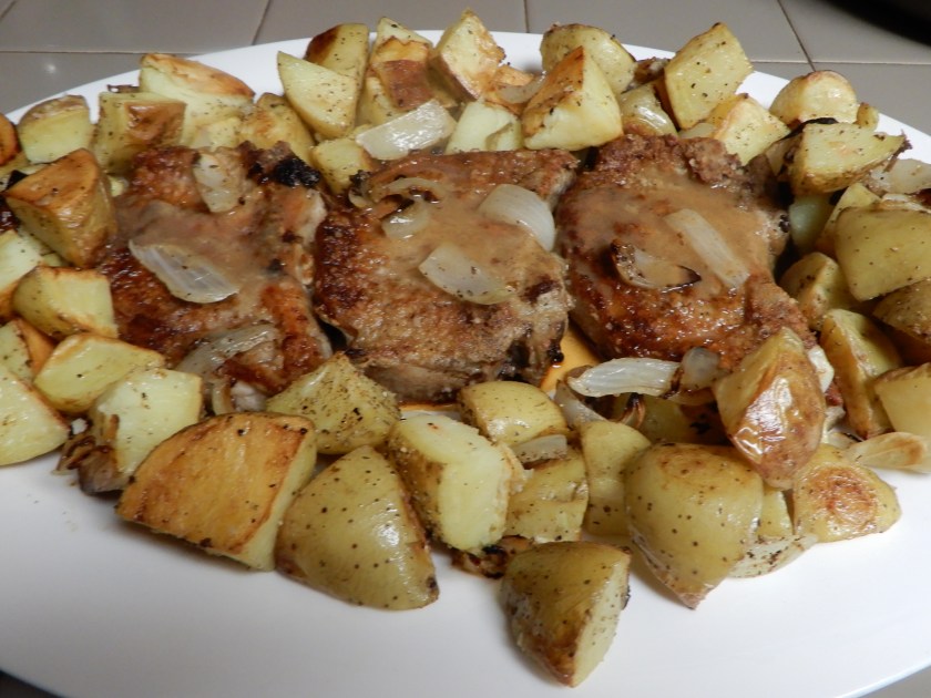 To Serve: Remove potatoes from oven, arrange on platter around the pork chops. Scatter some of the roasted onions directly on top of the pork chops for a little flair.