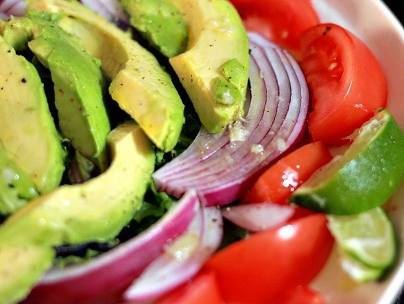 Peel and slice avocado, arrange slices over the bed of greens. Squeeze remaining lime halves over the avocados. Sprinkle salad with a little salt and pepper.