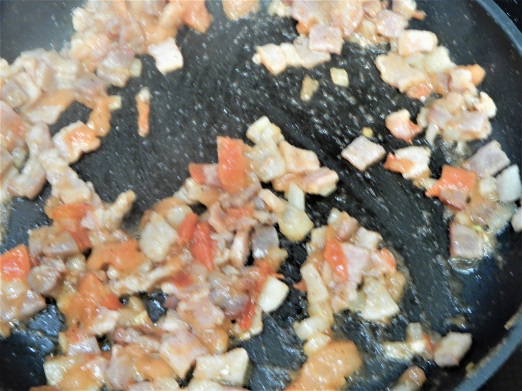 Season to taste with salt and pepper. Continue to fry until the bacon has browned, the onions are tender and the tomato has dissolved into the mixture.