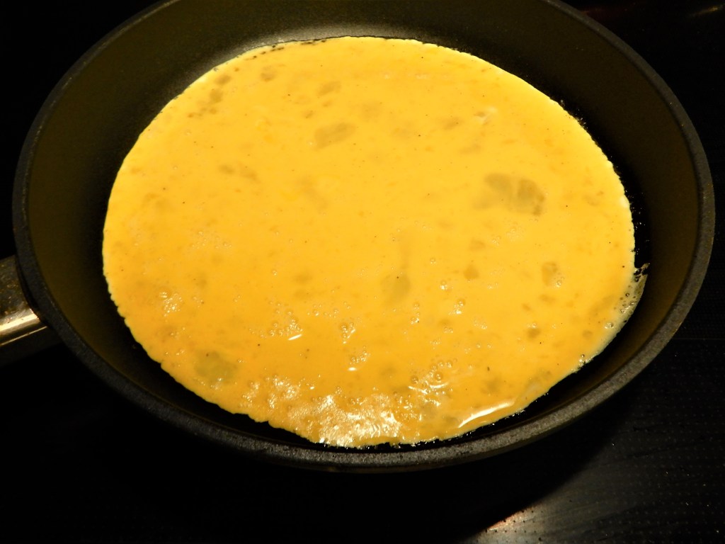 Pour eggs into the skillet, swirl to spread eggs evenly over the bottom of the skillet. Season with a little salt and pepper.