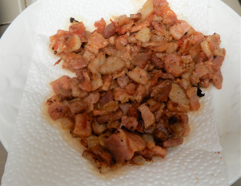 Dice bacon strips, scatter in a skillet over medium heat. While the bacon bits begin to fry, dice onion. Scatter onion over the bacon bits.