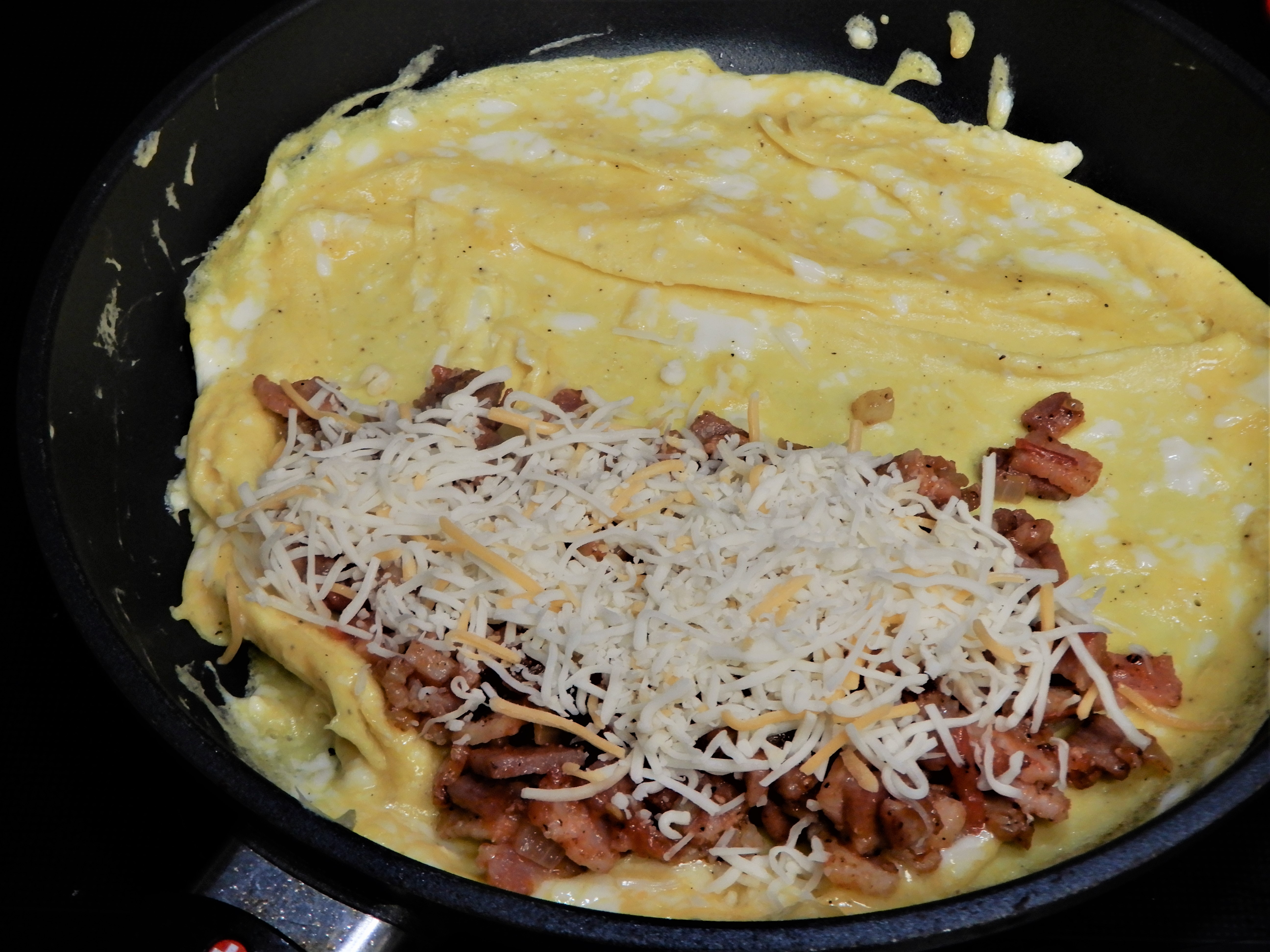 Remove from heat. Spread bacon mixture over one half of the Omelette. Scatter cheese over the bacon mixture. Fold remaining half over the filling. Let rest for a minute or two in the pan to help melt the cheese.