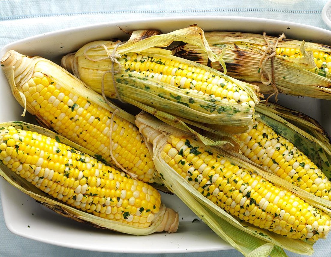 While the corn soaks, finely mince the basil and parsley. In a small bowl, mix herbs with the soft butter. Set aside.