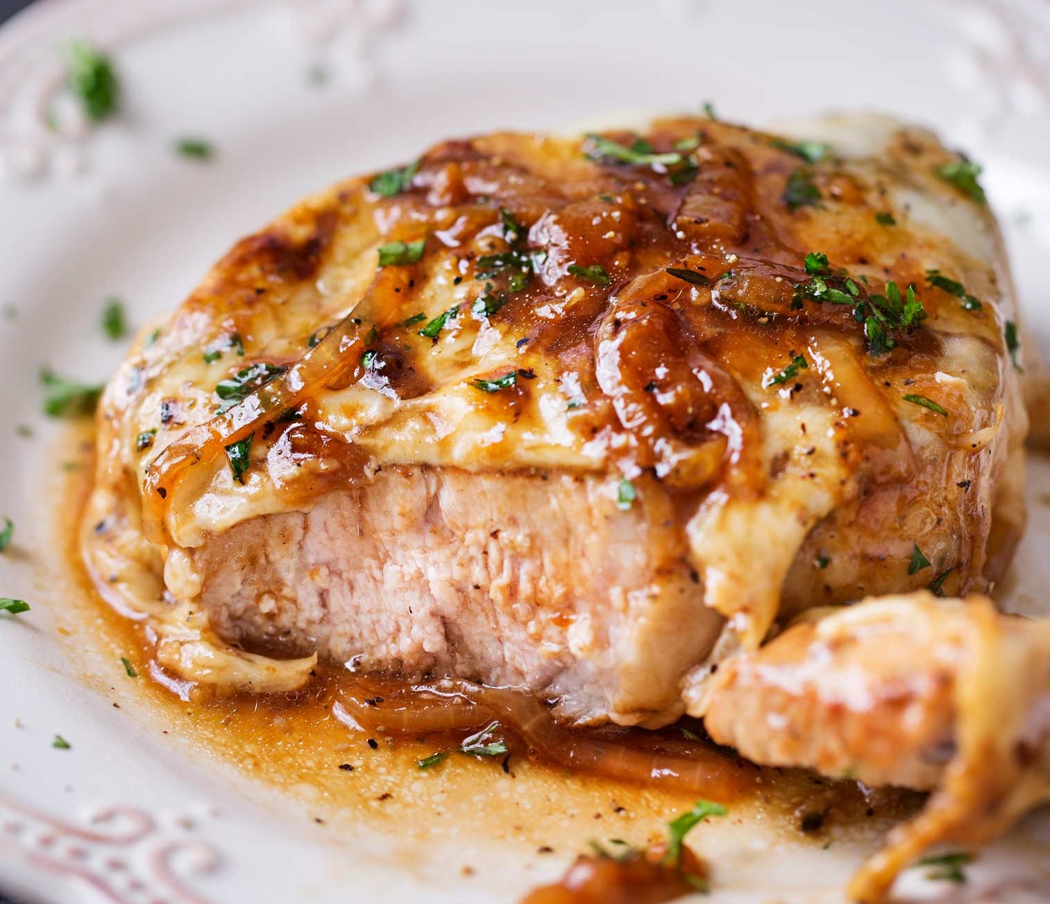 Add a few sprigs of fresh thyme and add skillet to oven and bake 8-10 minutes, until cheese is melted and gooey.  Before serving, spoon some of the beef stock-onion mixture over the top of the cheese. Snip parsley leaves, sprinkle over chops. Season with a pinch more black pepper if desired.