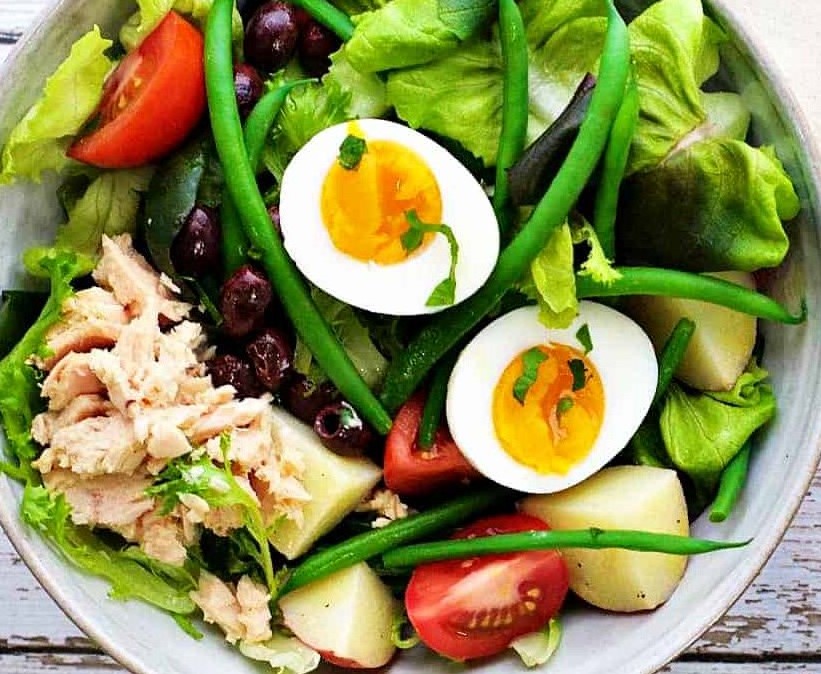 Wash butter lettuce, break leaves apart, set aside. Cut cherry tomatoes in half or quarters depending upon size, set aside. Drain olives, set aside. Drain tuna, flake meat and set aside. When ready to assemble salad, cut eggs in half.