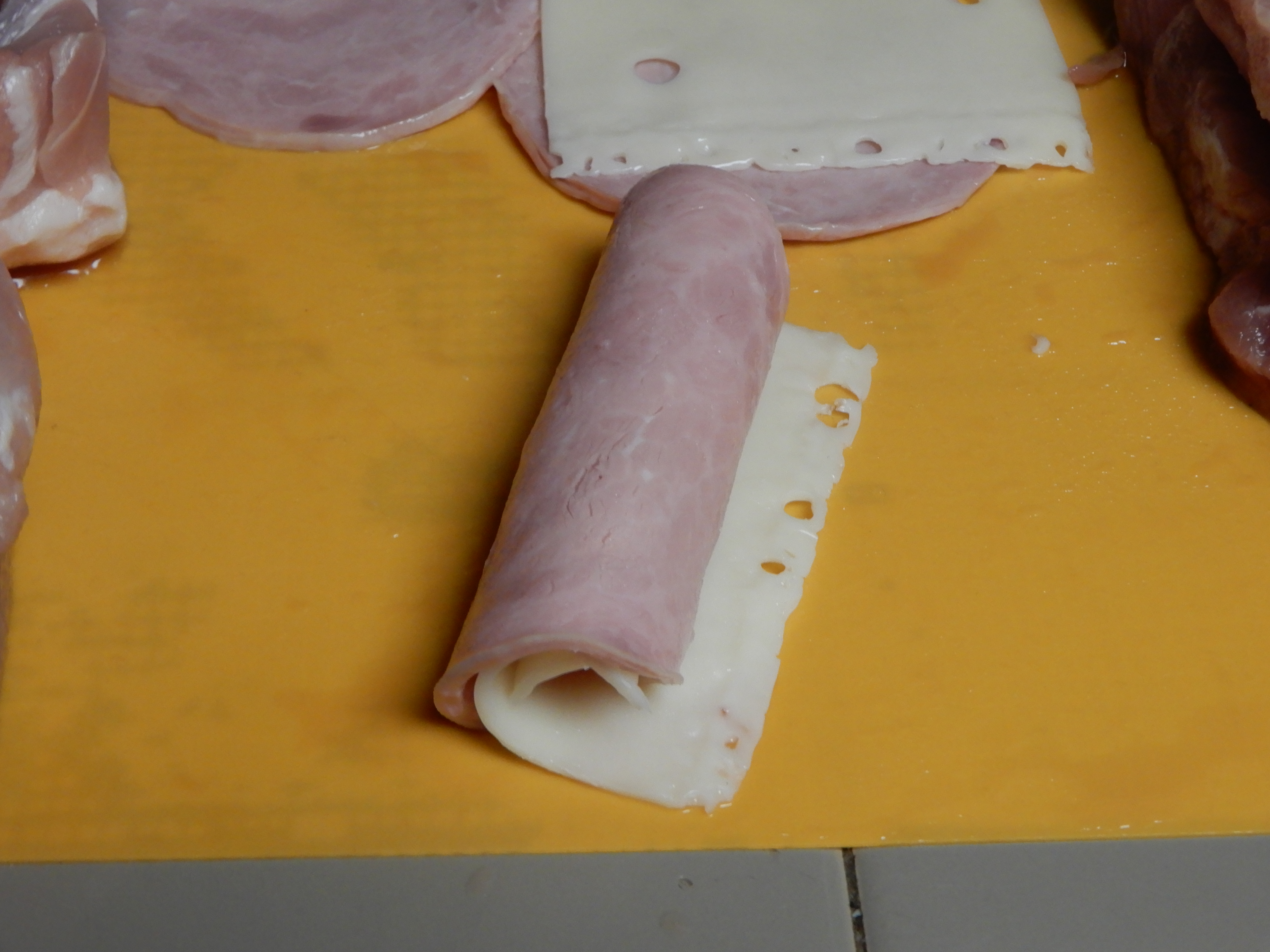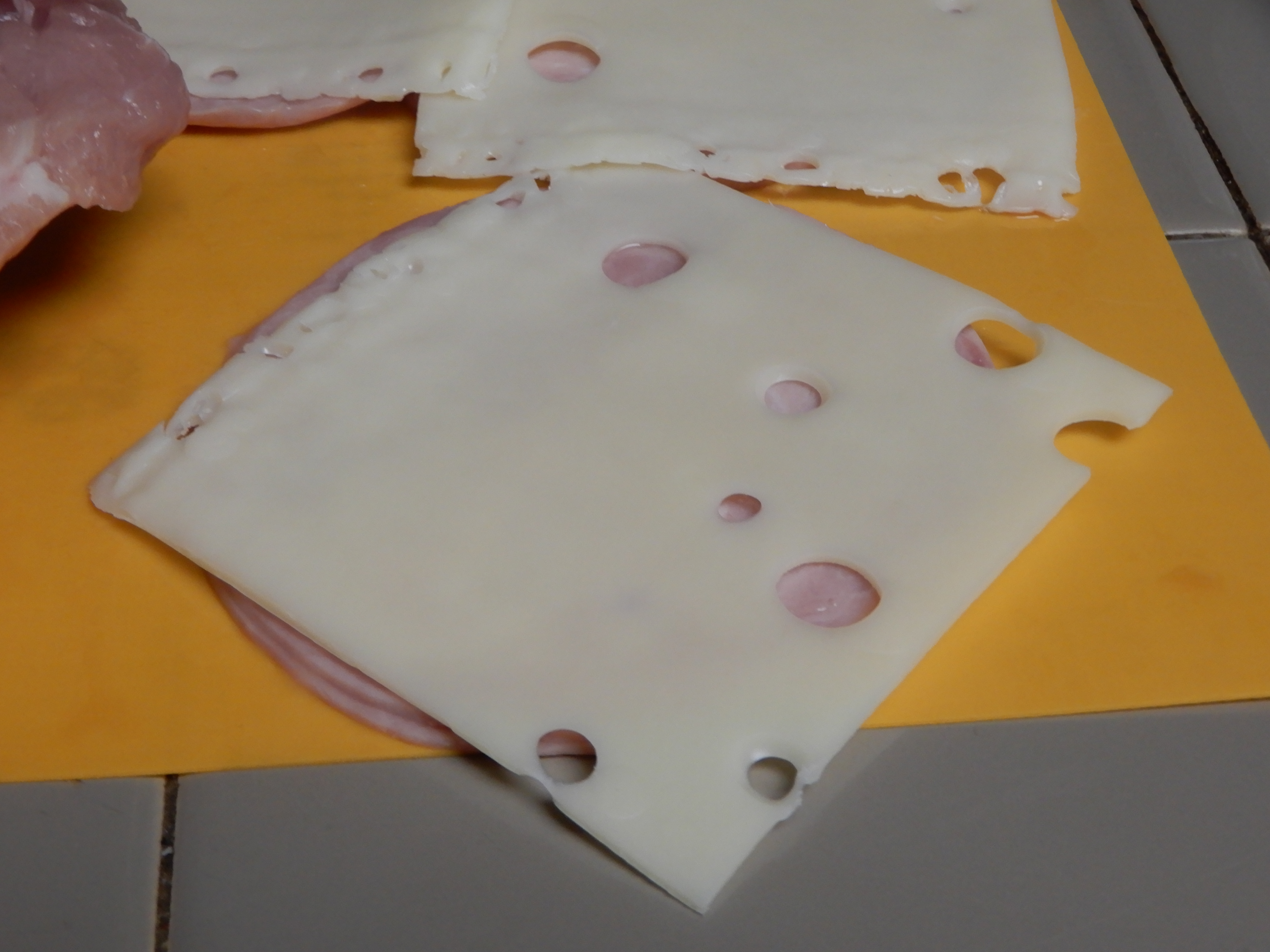 Place Swiss cheese slices on top of ham slices, and starting from one of the short ends, roll up. Tuck 1 ham and cheese roll into each pork chop pocket.