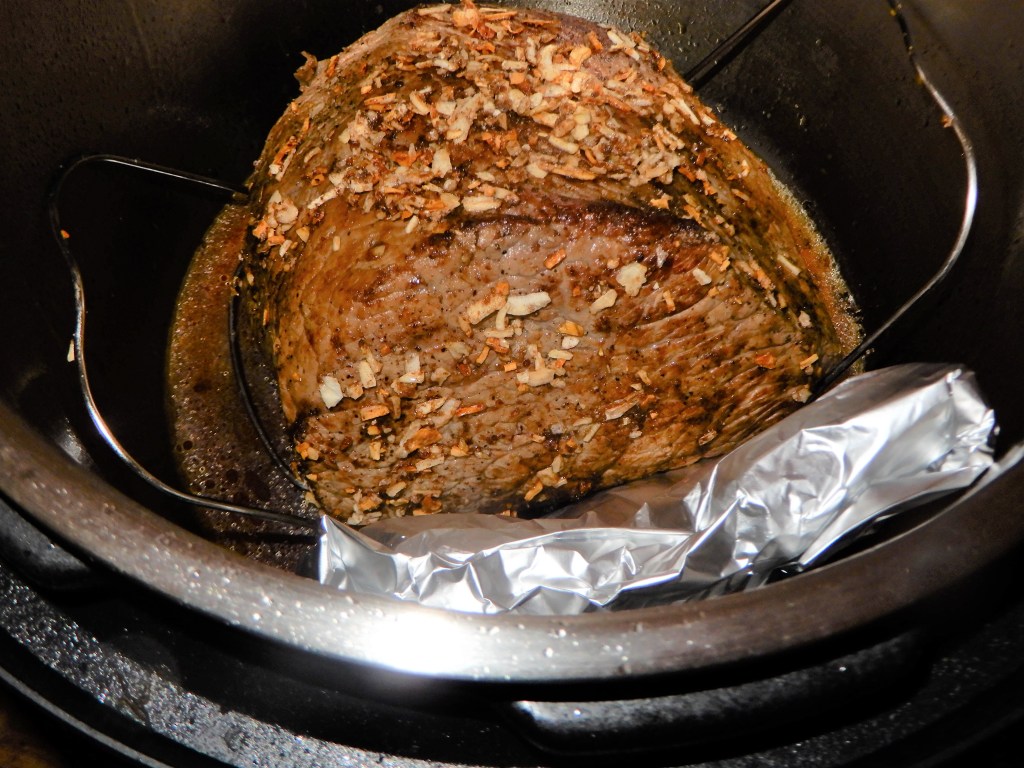 Roll the meat in the soup mix, pressing mix into the meat to coat. Place meat on the trivet insert and set aside.