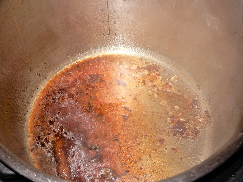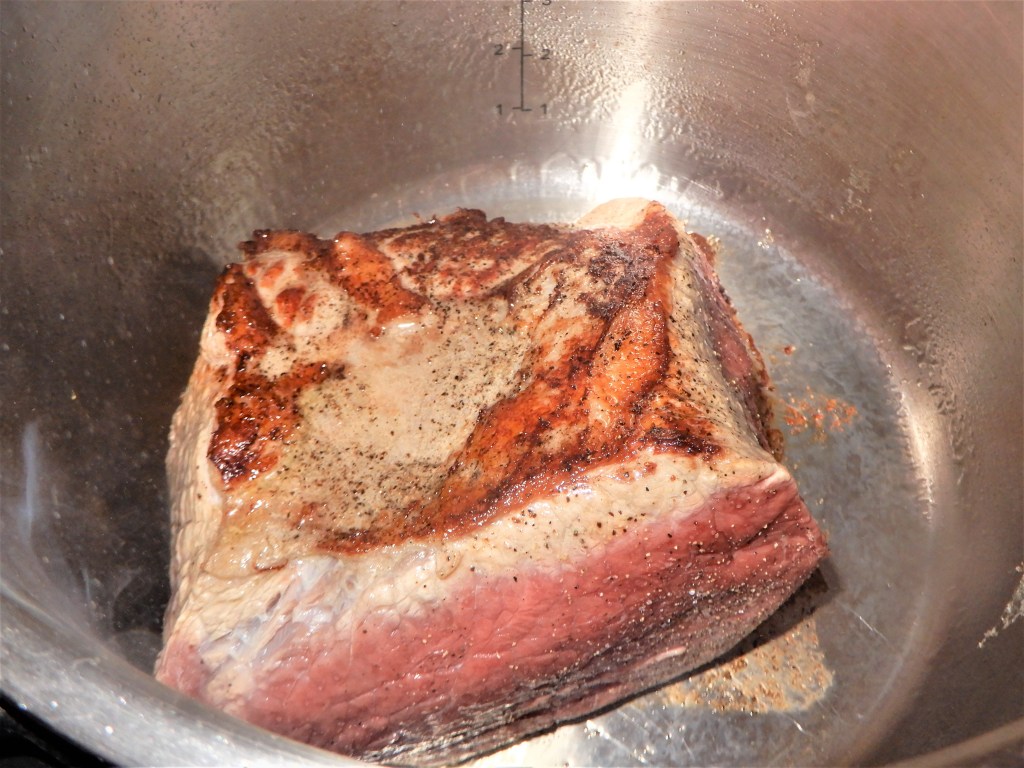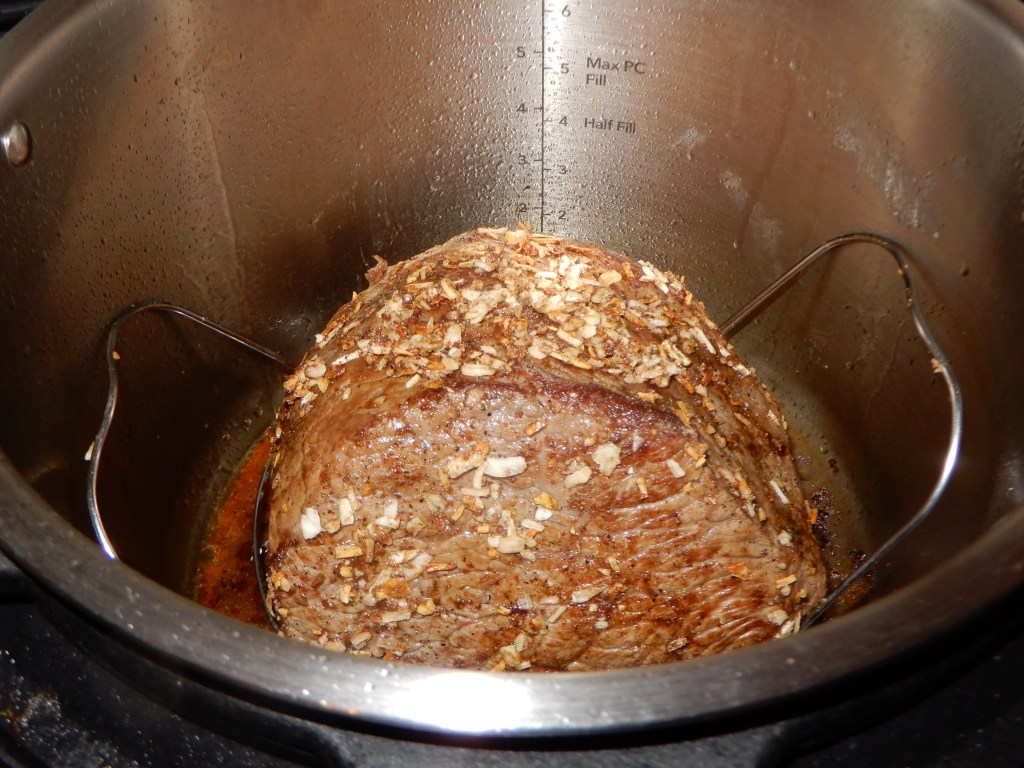 Pour 1/4 cup of the beef stock into the bottom of the Instant Pot insert. Use a wooden spoon, scrape up the browned bits and deglaze the pot. Lower the trivet into the pot, pour remaining 3/4 cup of beef stock around the meat. Add more if necessary so the stock is just barely touching the meat, about 1/4 inch up the side.