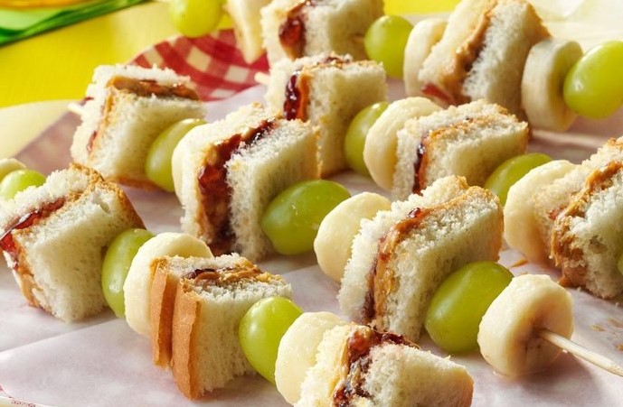 Assemble spears by alternating threads of grapes, sandwich squares and banana slices onto each skewer. Serve immediately.