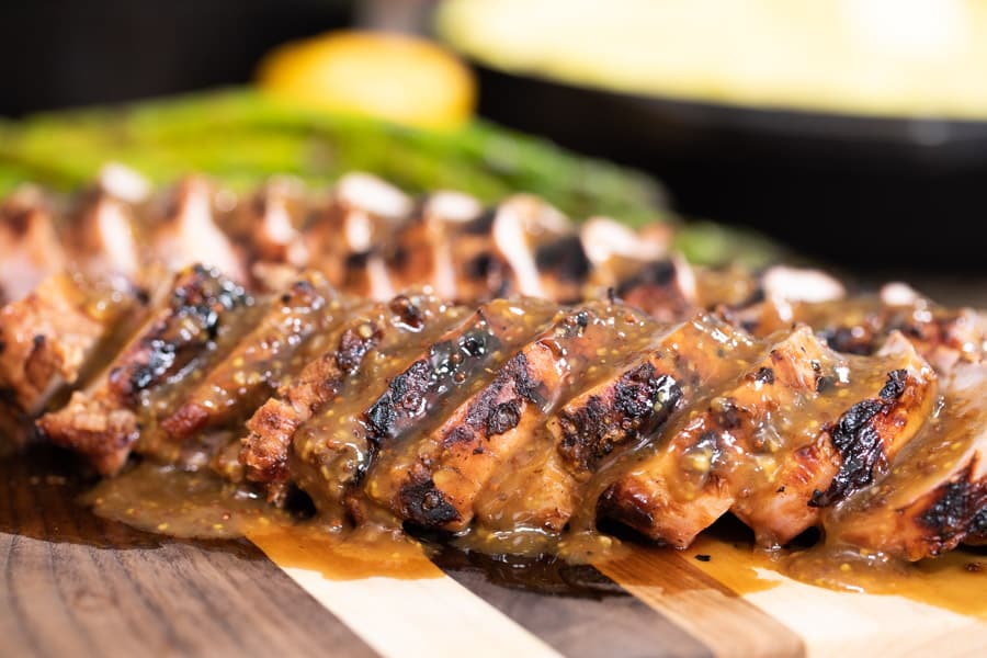 Slice the pork tenderloin against the grain into 1/2 inch thick medallions. Top with a spoonful of the glaze before serving.