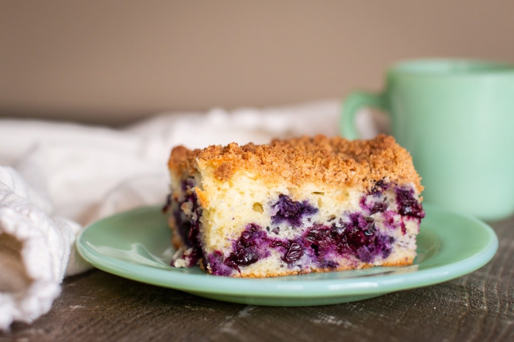 Spoon half of the batter into the prepared baking pan, spread out evenly. Top batter with blueberries, spread out evenly. Spoon remaining batter over the berries. Sprinkle streusel topping over the cake.