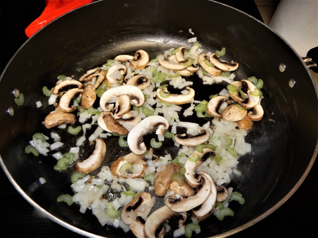 Heat a heavy bottom large high-sided skillet over medium-high heat. Melt butter, sauté onions, mushrooms and celery until almost tender.