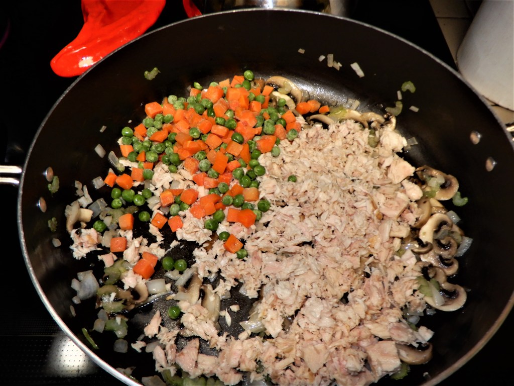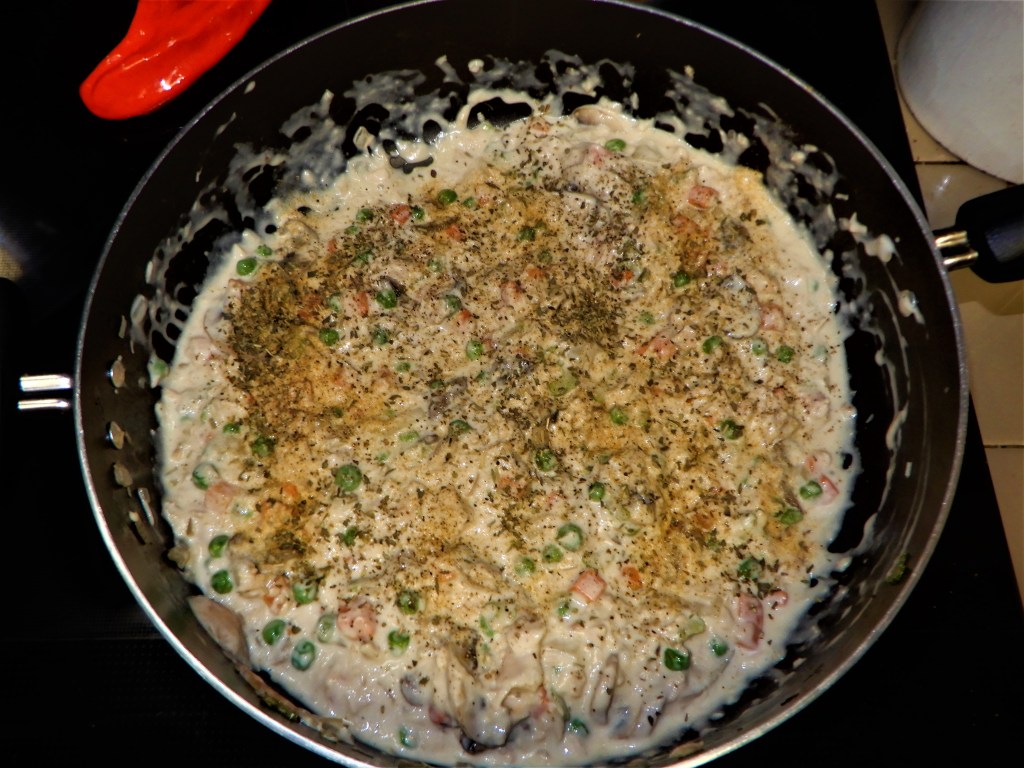 Add tuna, peas and carrots. Stir in Alfredo Sauce. Season with garlic powder and fresh pepper. Stir well, let simmer for 10 minutes for flavors to blend.
