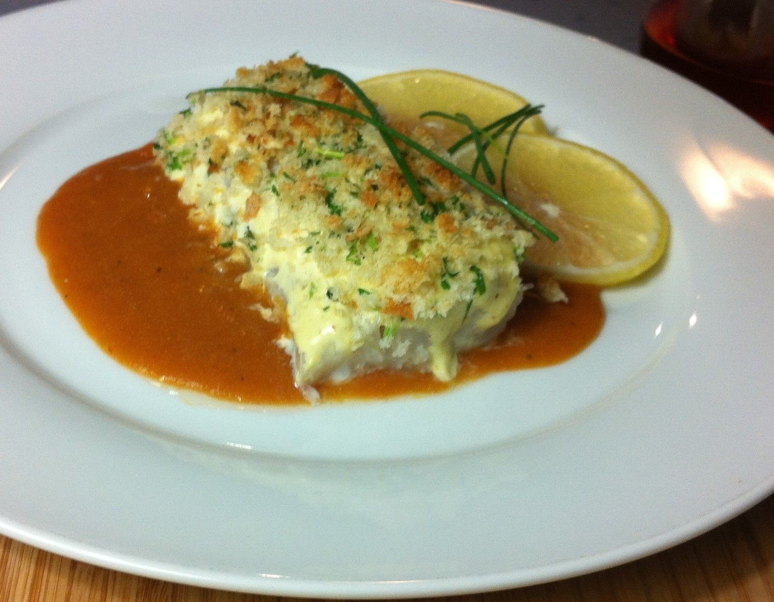 To serve, ladle sauce on warm dinner plates. Place Haddock on the sauce. Garnish with lemon and chive strands.