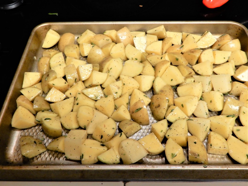 Place potatoes in a bowl, drizzle with olive oil and toss to coat well. Season generously with salt and pepper to taste. Add minced garlic with chopped rosemary. Toss to blend well.