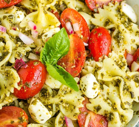 In a large bowl, toss cooled pasta with pesto, adding reserved pasta water, 1 tablespoon at a time, until pesto evenly coasts pasta.