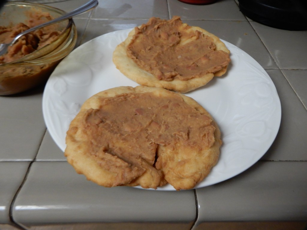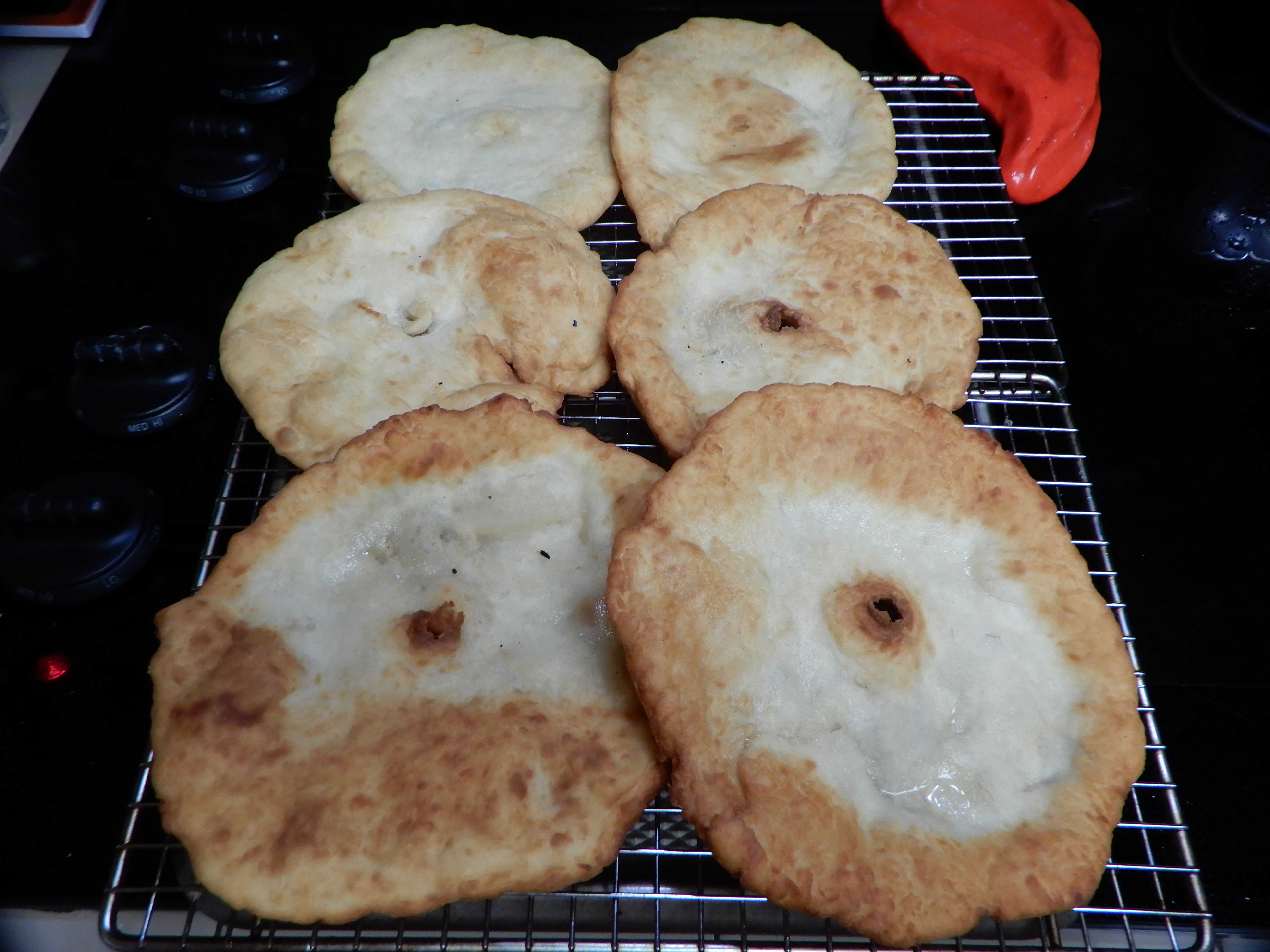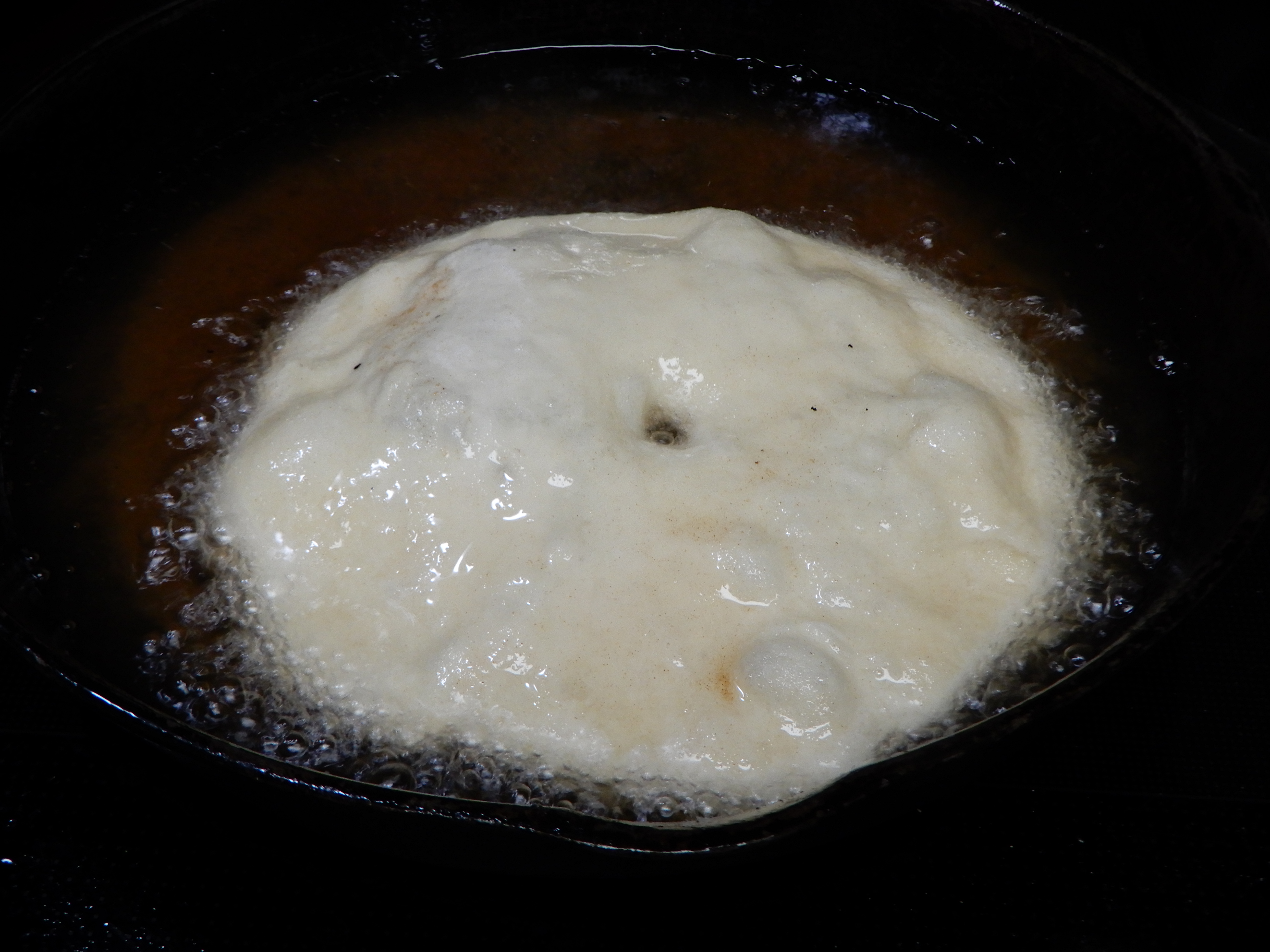Fry bread in hot oil until golden brown, swirling as it cooks to prevent burning. Use the end of a wooden spoon to swirl bread as it cooks, flip and continue to brown until done. Place on a paper towel, blot off excess grease and set aside in a warm oven. Repeat until all the bread has been fried.
