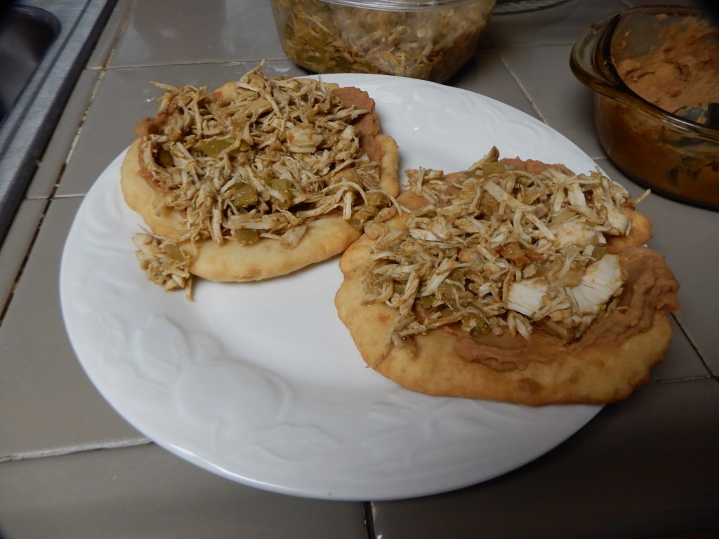 Spread warm beans on fry bread. Top with shredded chicken and garnish as desired and enjoy.