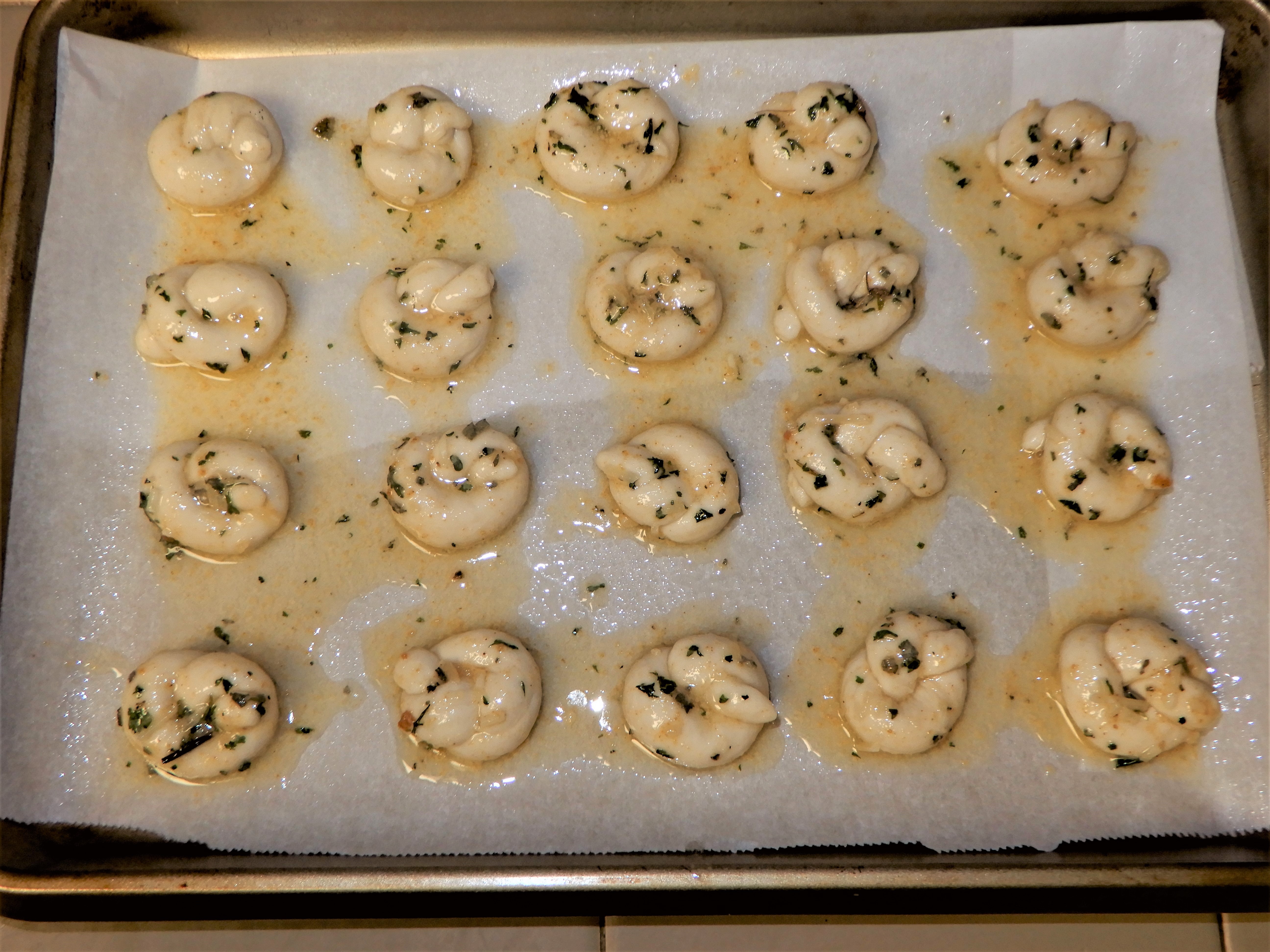 Place knots onto the prepared baking sheet and brush each knot with half of the butter mixture. Place into oven and bake until golden brown, about 8-10 minutes.