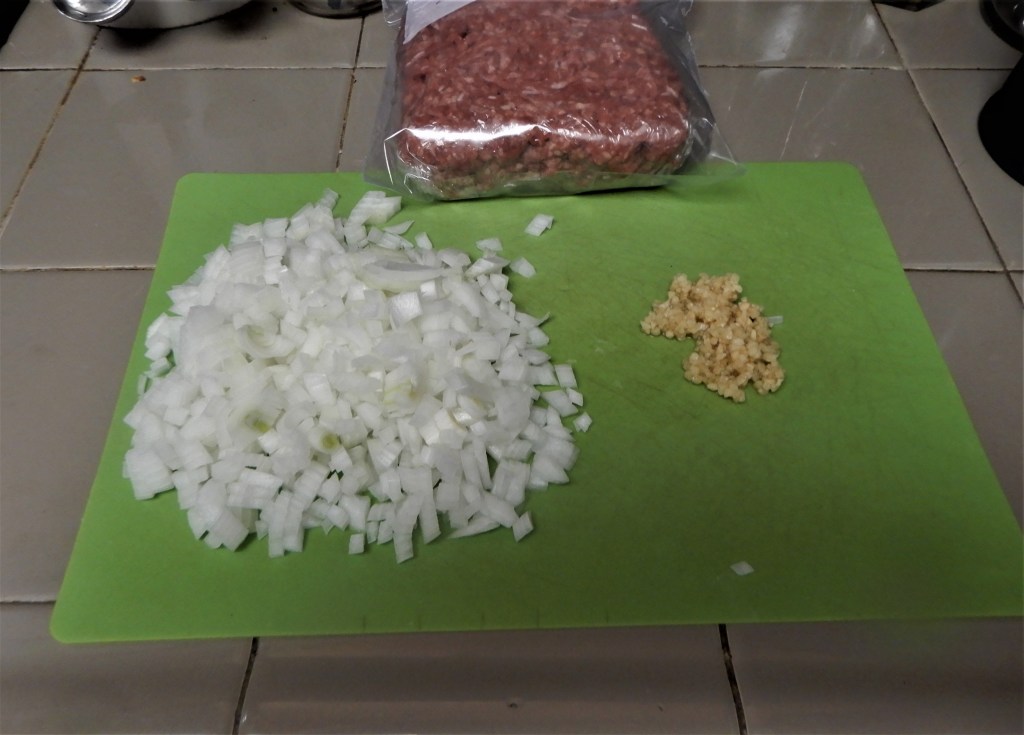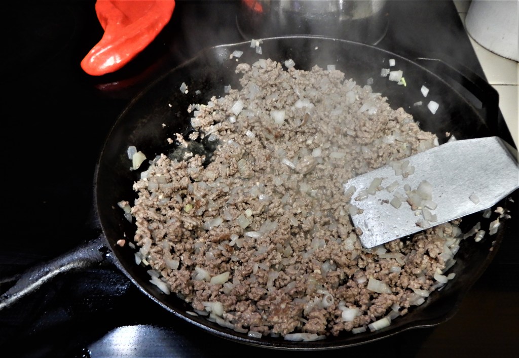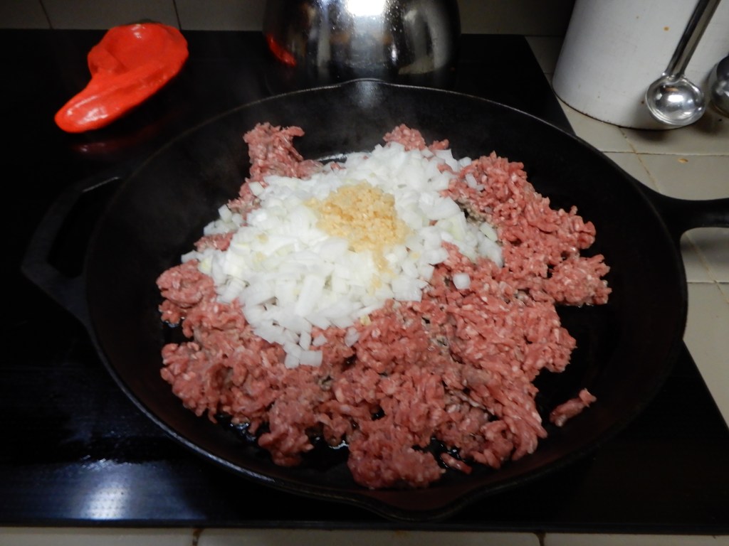 In a large skillet, add ground beef, onion and garlic. Brown ground beef on medium heat. Drain grease. Return browned ground beef to large skillet.