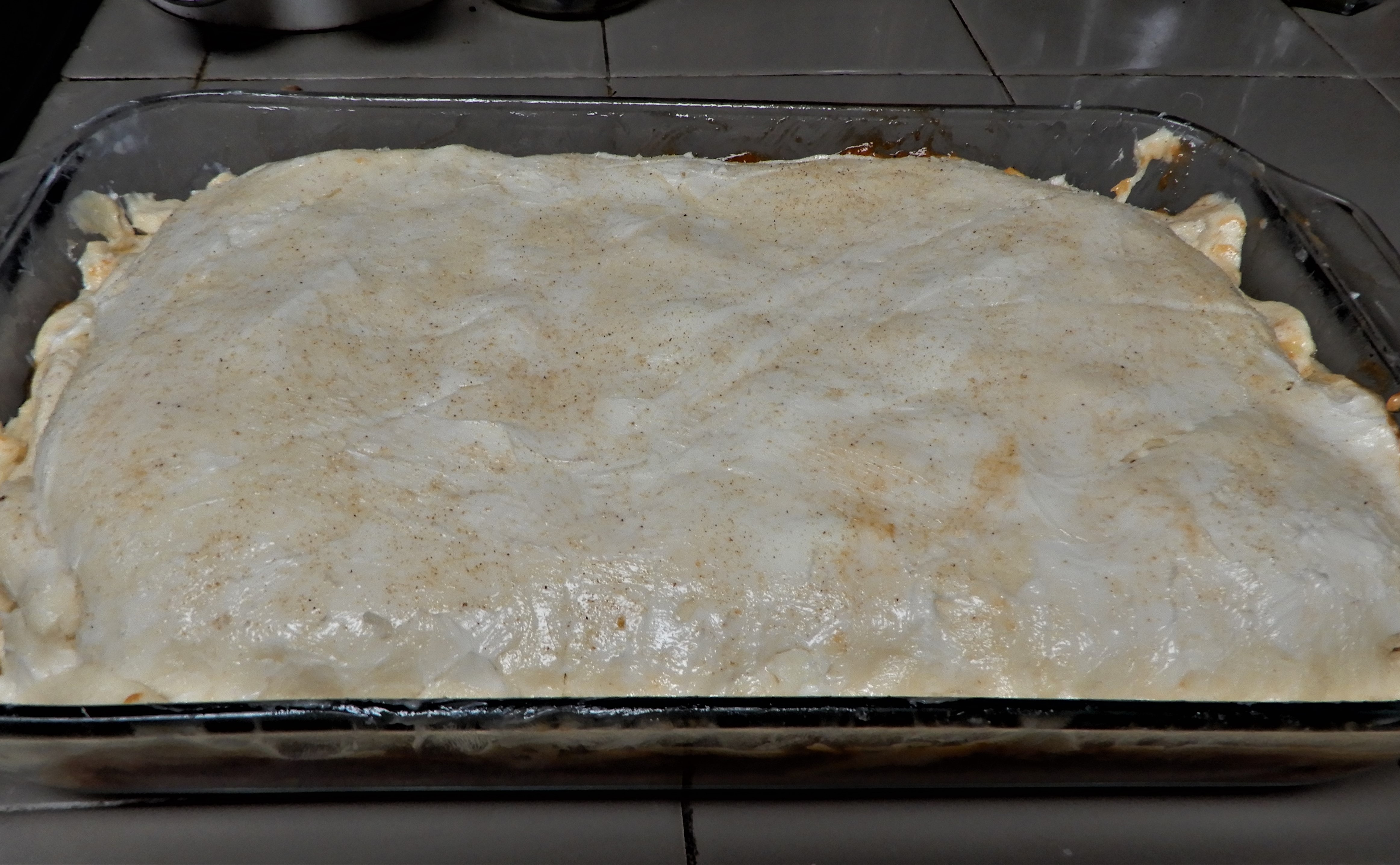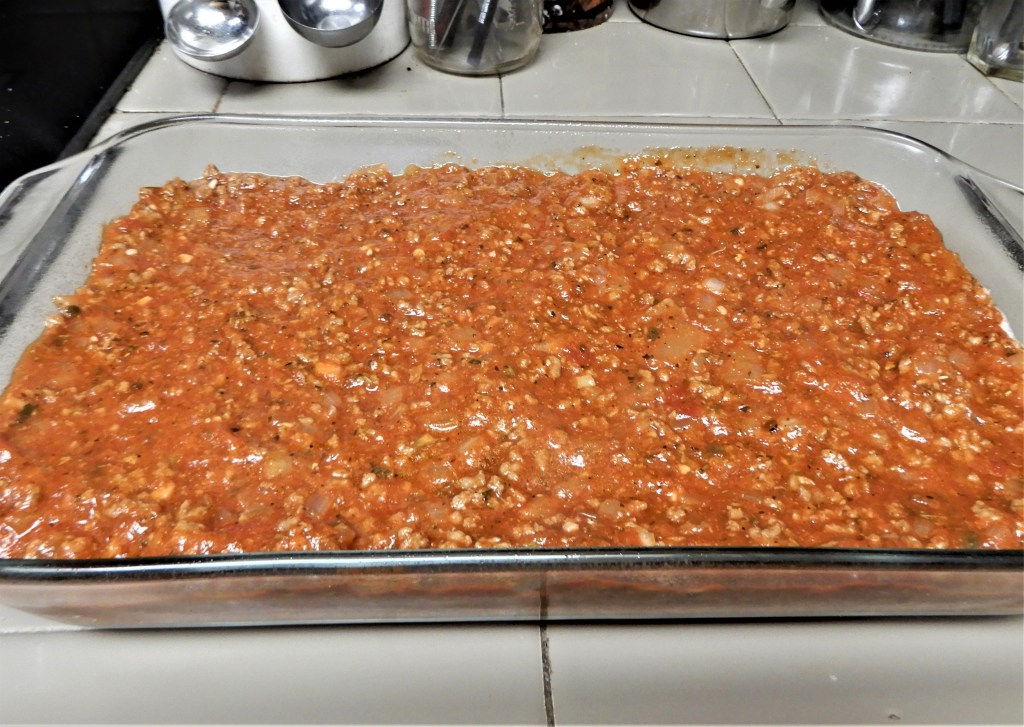 Add beefy sauce mixture to the bottom of the prepared baking dish. Spread evenly, set aside.