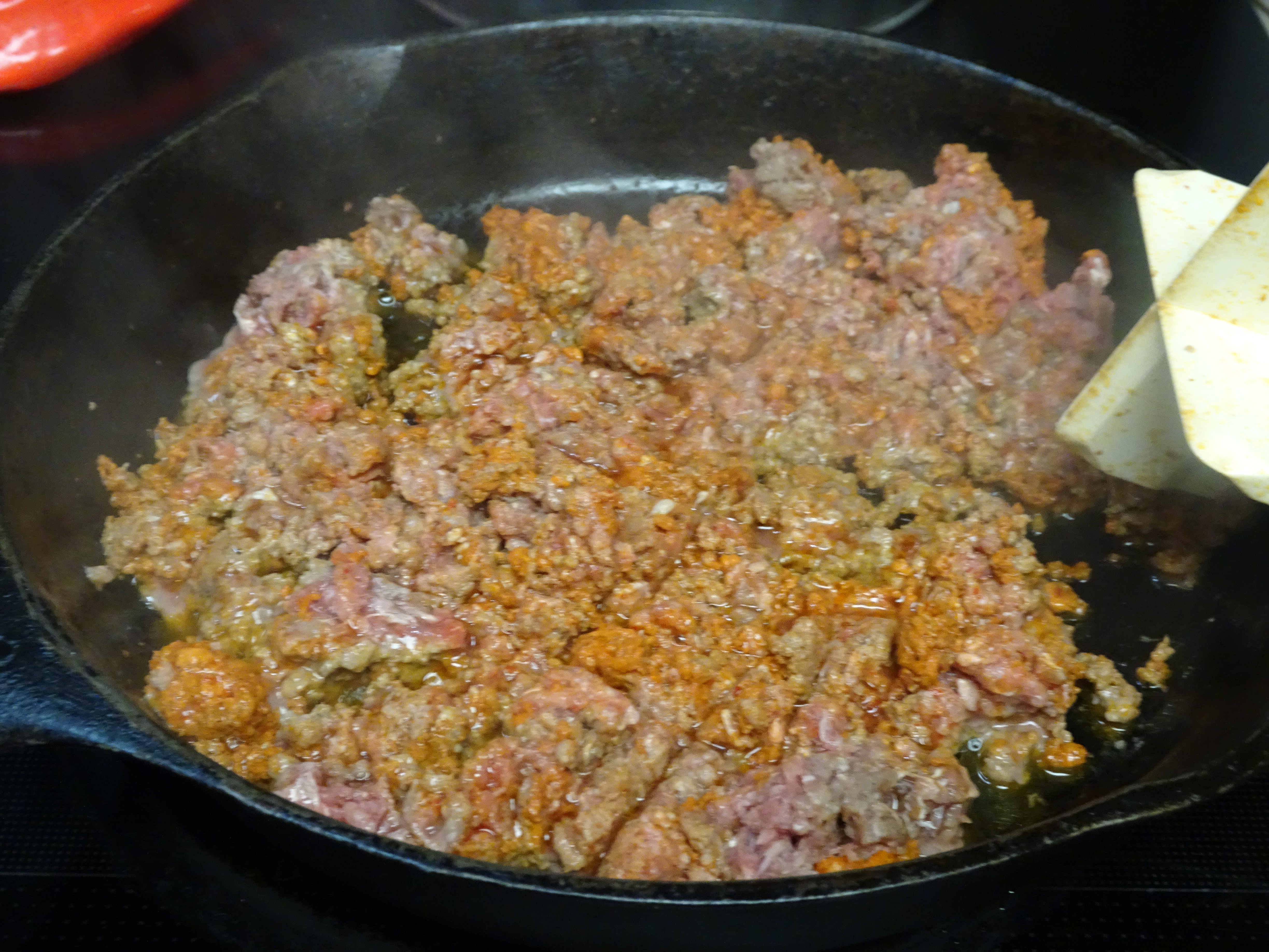 Meanwhile, mix ground beef and chorizo together in a cast iron skillet. Brown meat over medium heat until cooked through. Drain well.