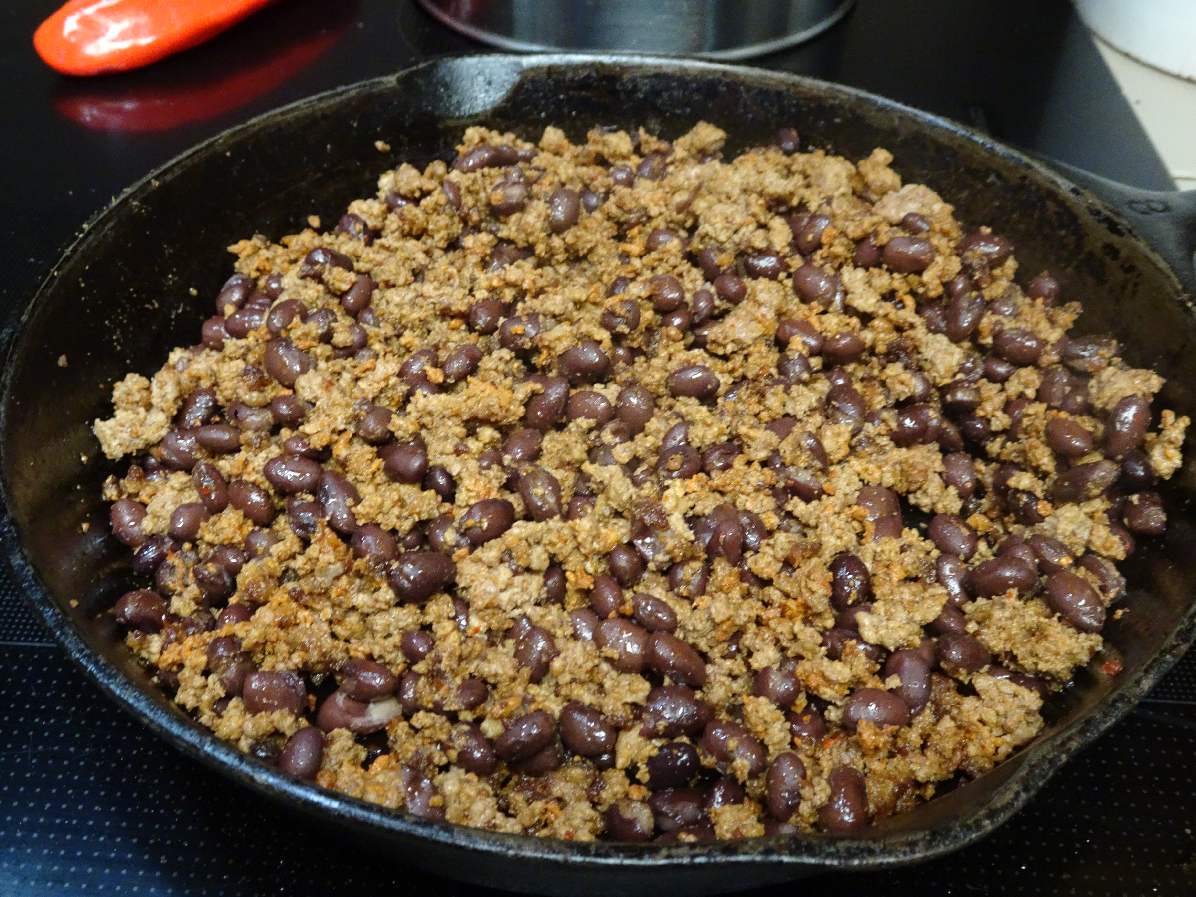 Rinse and drain black beans. Add to the meat mixture in the skillet. Heat through.