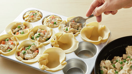 Fill each muffin cup with about 1/4 cup chicken mixture. Fold and crimp pie crust over filling with the center open.