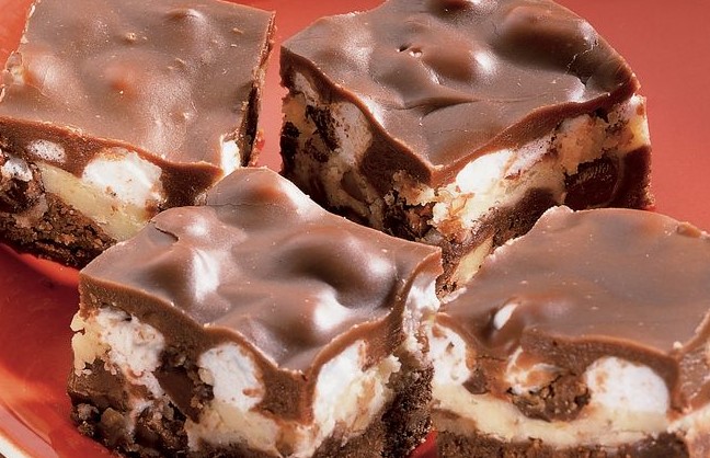 It’s also National Rocky Road Day. Now I will confess my first thoughts for National Rocky Road Day was to suggest a nice bowl or cone of Rocky Road Ice Cream, the most popular way to get that chocolate, nut, marshmallow fix. Then I remembered that one of my favorite childhood candy bars was a Rocky Road. Mega sugar overload. These fudge bars are a great way to celebrate National Rocky Road Day in a more grownup, sophisticated way. Enjoy!