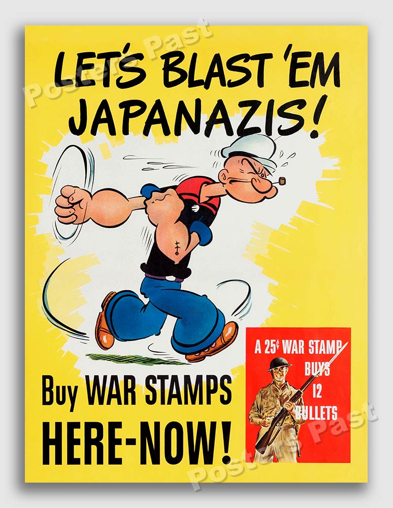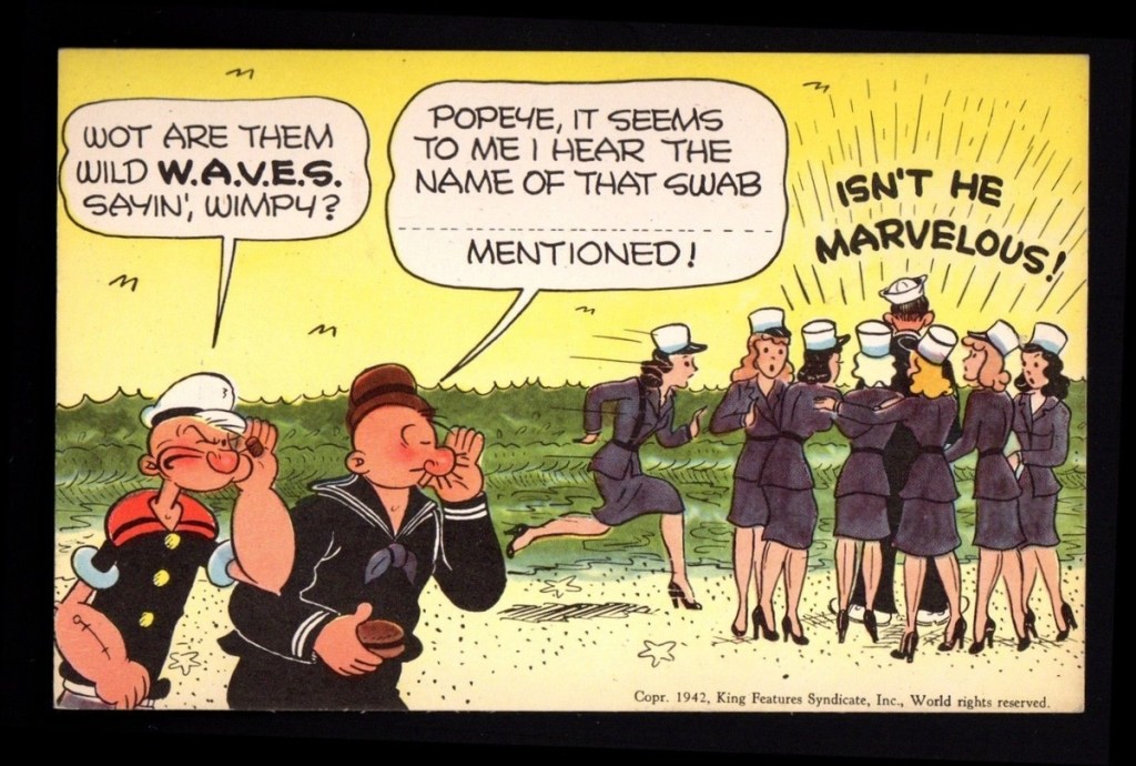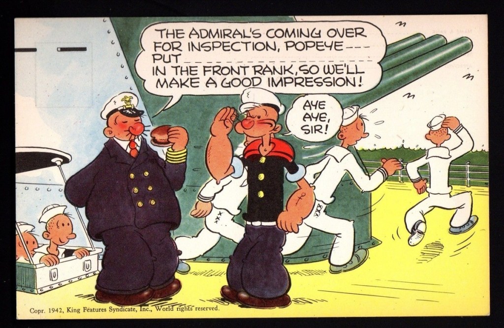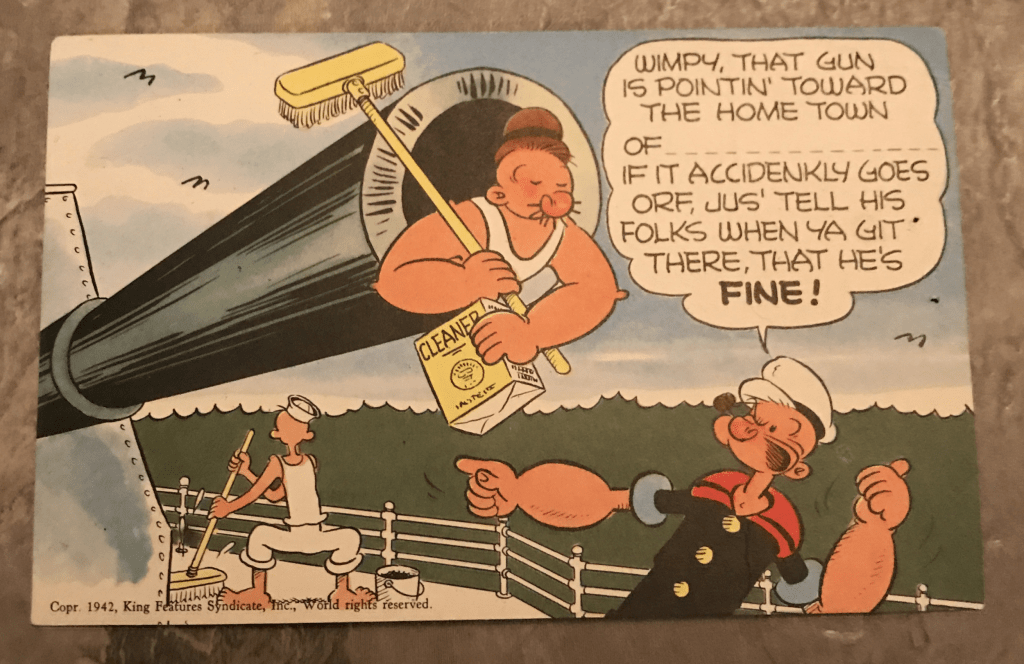 But then I began to hear a song playing in my head. I’m Popeye the Sailor Man. Why? I Haven’t a clue. Cartoonist Elzie Crisler Seger created a comic strip called Thimble Theater. In 1919 On January 17, 1929 Popeye made his appearance. By 1933, Mac Fleisher adapted the Thimble Theater character into his own series Popeye the Sailor Man for Paramount Pictures. It’s reasonable to assume American GIs knew of Popeye. And by the postcards created during World War II, these soldiers were no strangers to J. Wellington Wimpy, better known as Popeye’s straight man, Wimpy. Back home, Popeye encouraged Americans to support the war efforts with War Bonds.
