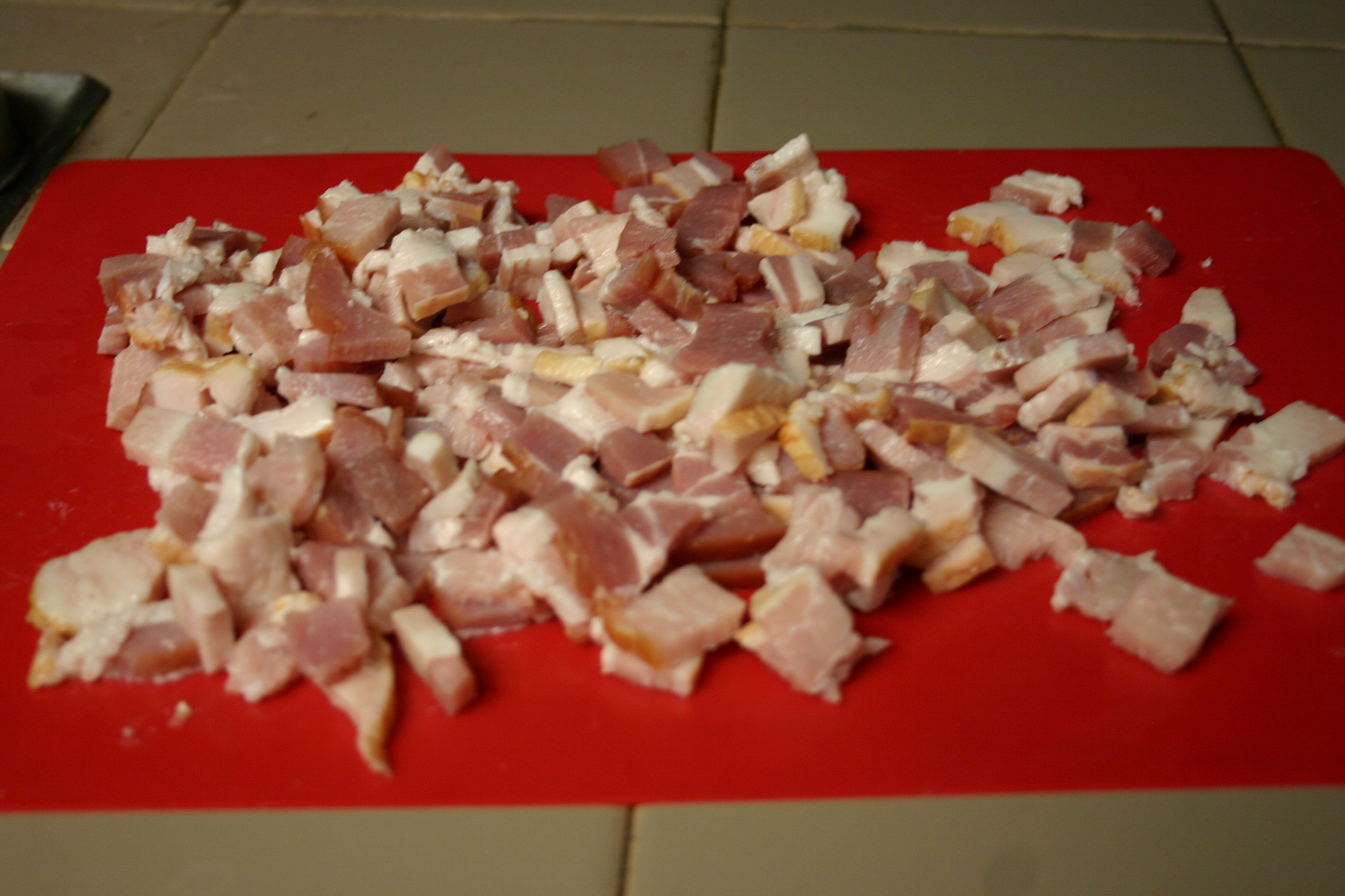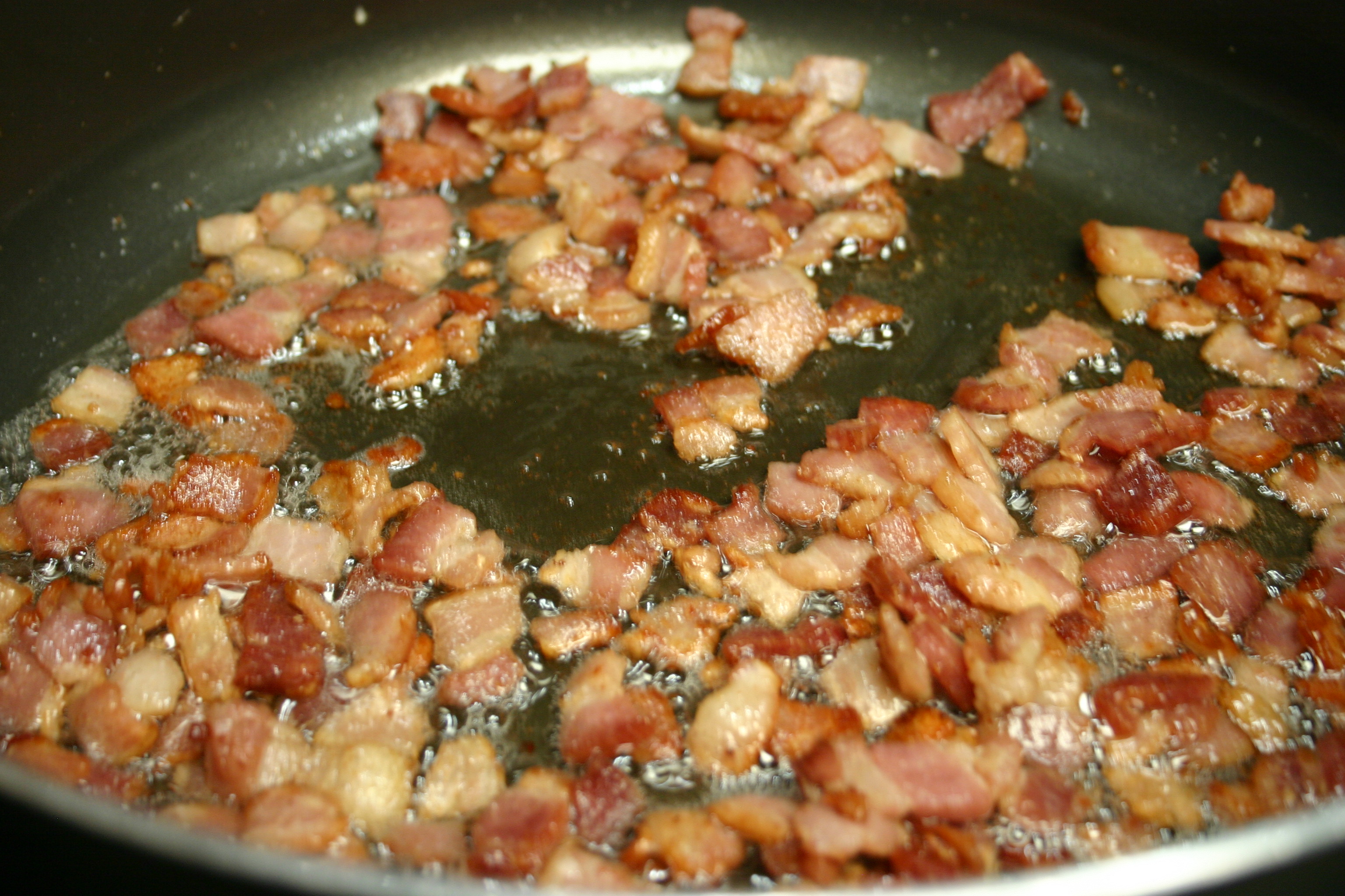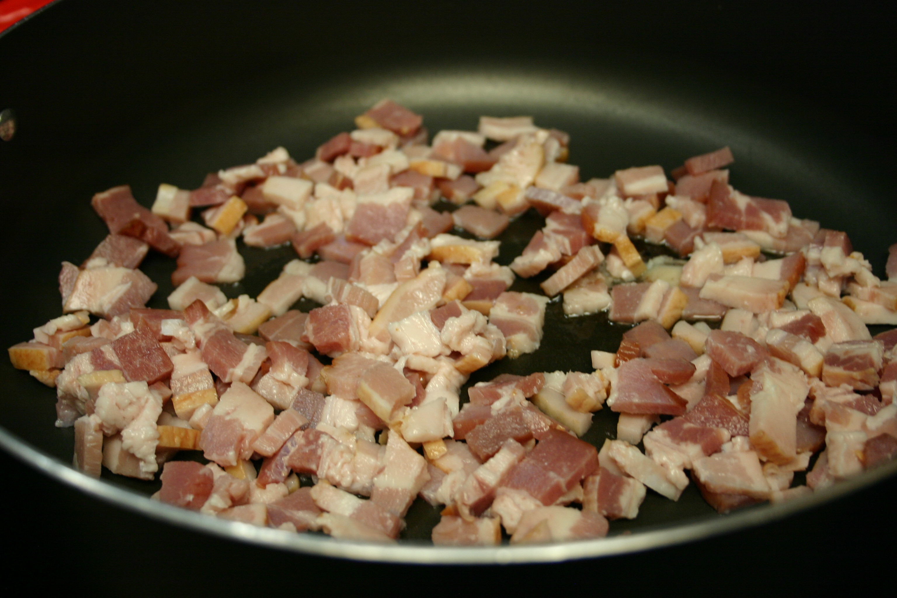 Stack the bacon together, cut in thirds lengthwise, then dice the strips into pieces. Heat a large skillet over medium heat. Fry bacon pieces until crisp, stirring as needed for even cooking. Move bacon to paper towels to drain. Leave all but a tablespoon or so of bacon grease in the skillet.