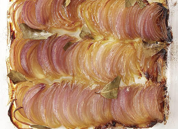 Uncover the dish and continue to braise until all of the liquid has evaporated and the onions are darkly roasted and glossy, about 20 minutes. Remove the bay leaves and serve the onions warm or at room temperature.