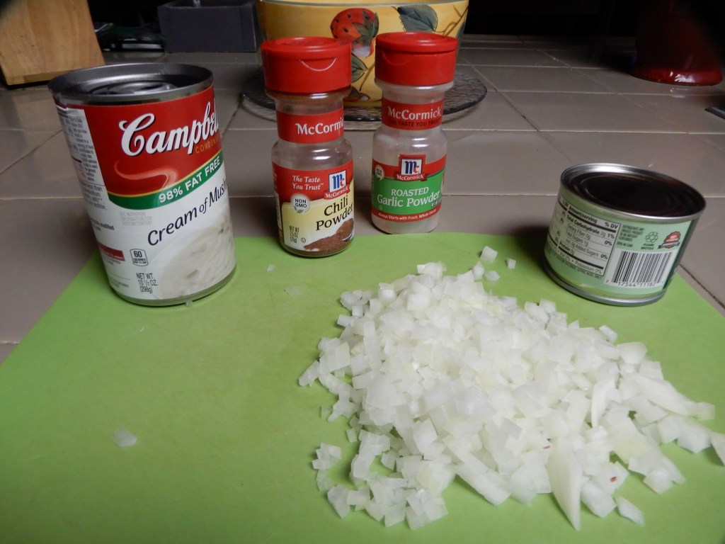 Drain corn, set aside. Peel and dice onion, set aside. Mix garlic powder, salt, pepper and chili powder in a small bowl. Set aside.