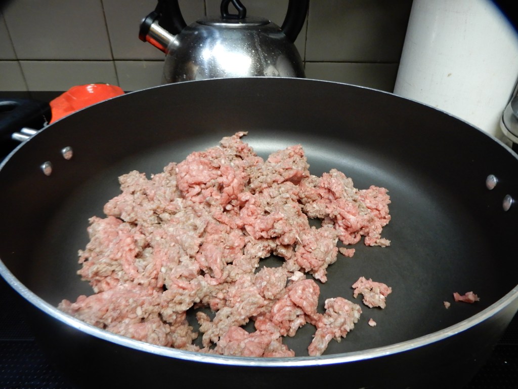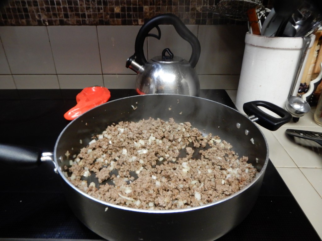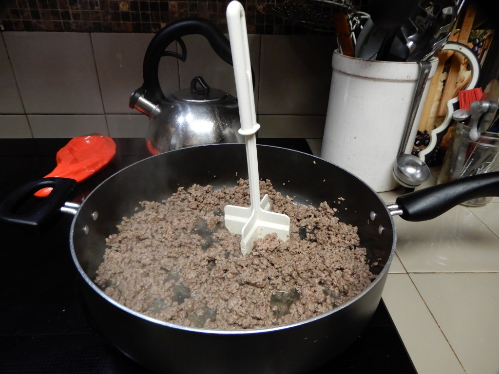 Brown ground beef. Drain well, return to skillet. Add onions and seasoning mix. Heat through, then remove from heat.