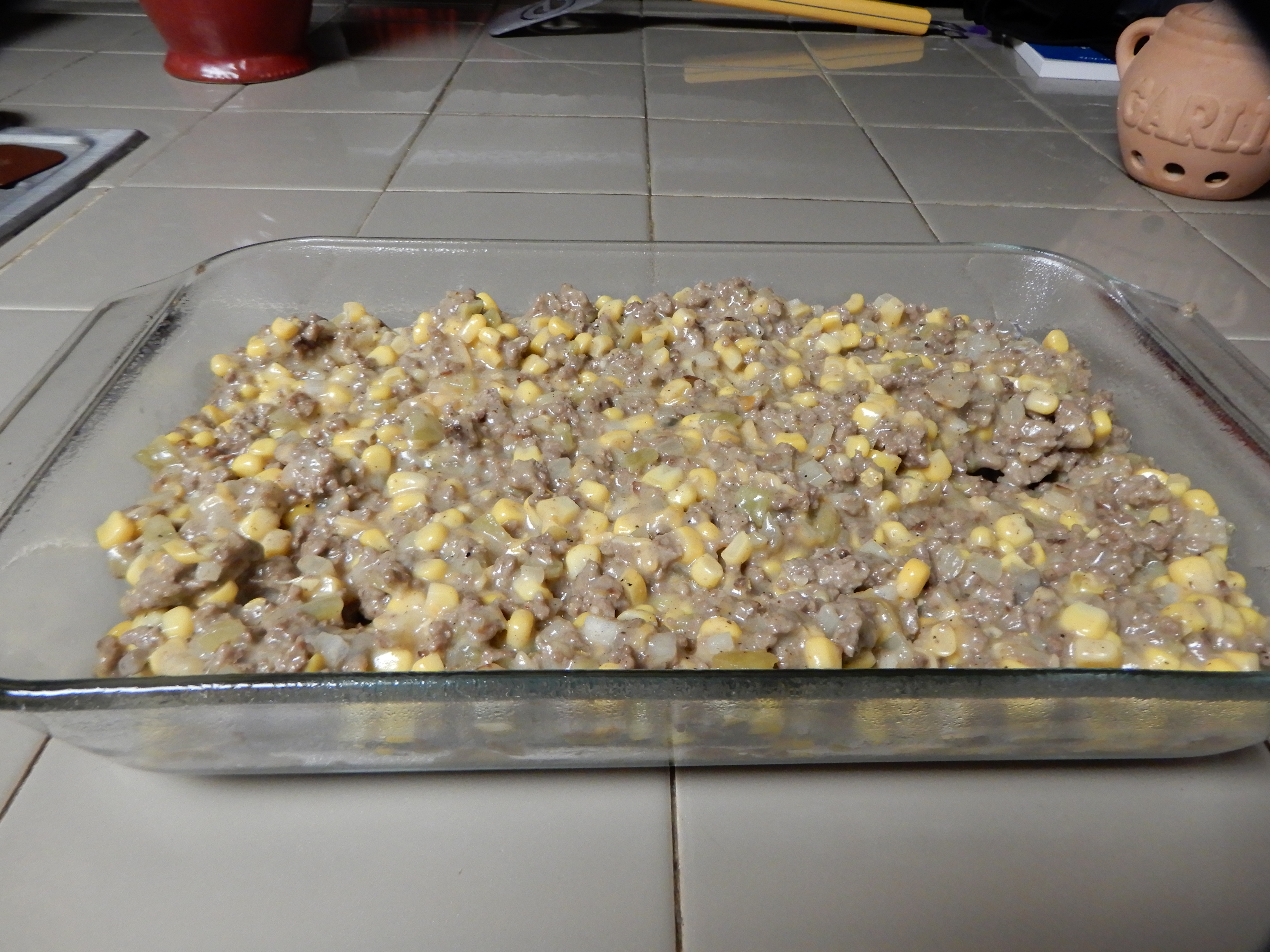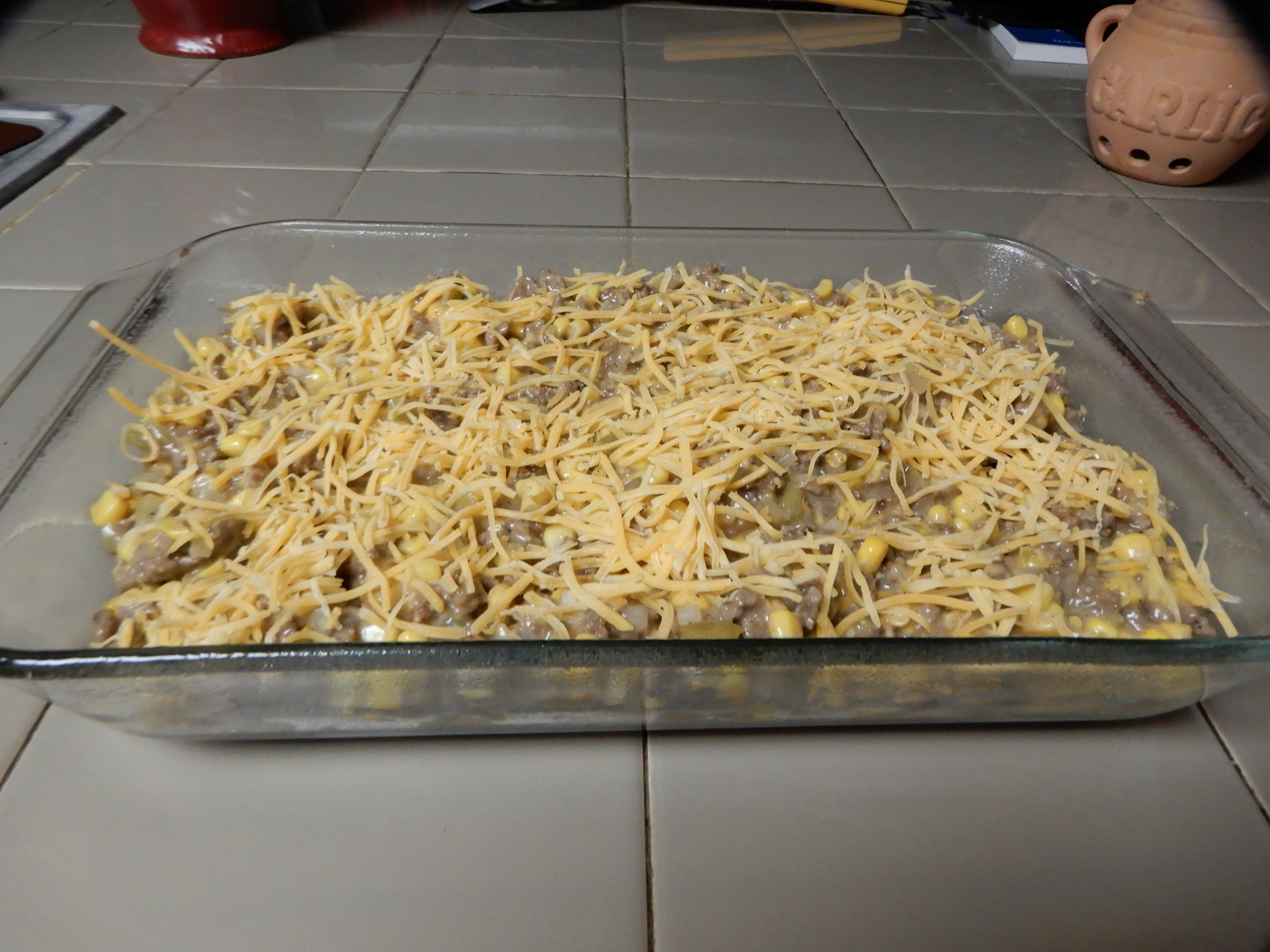 Add cream of mushroom soup, milk, drained corn, undrained chilis, and 1/2 cup cheese to browned ground beef. Mix well.