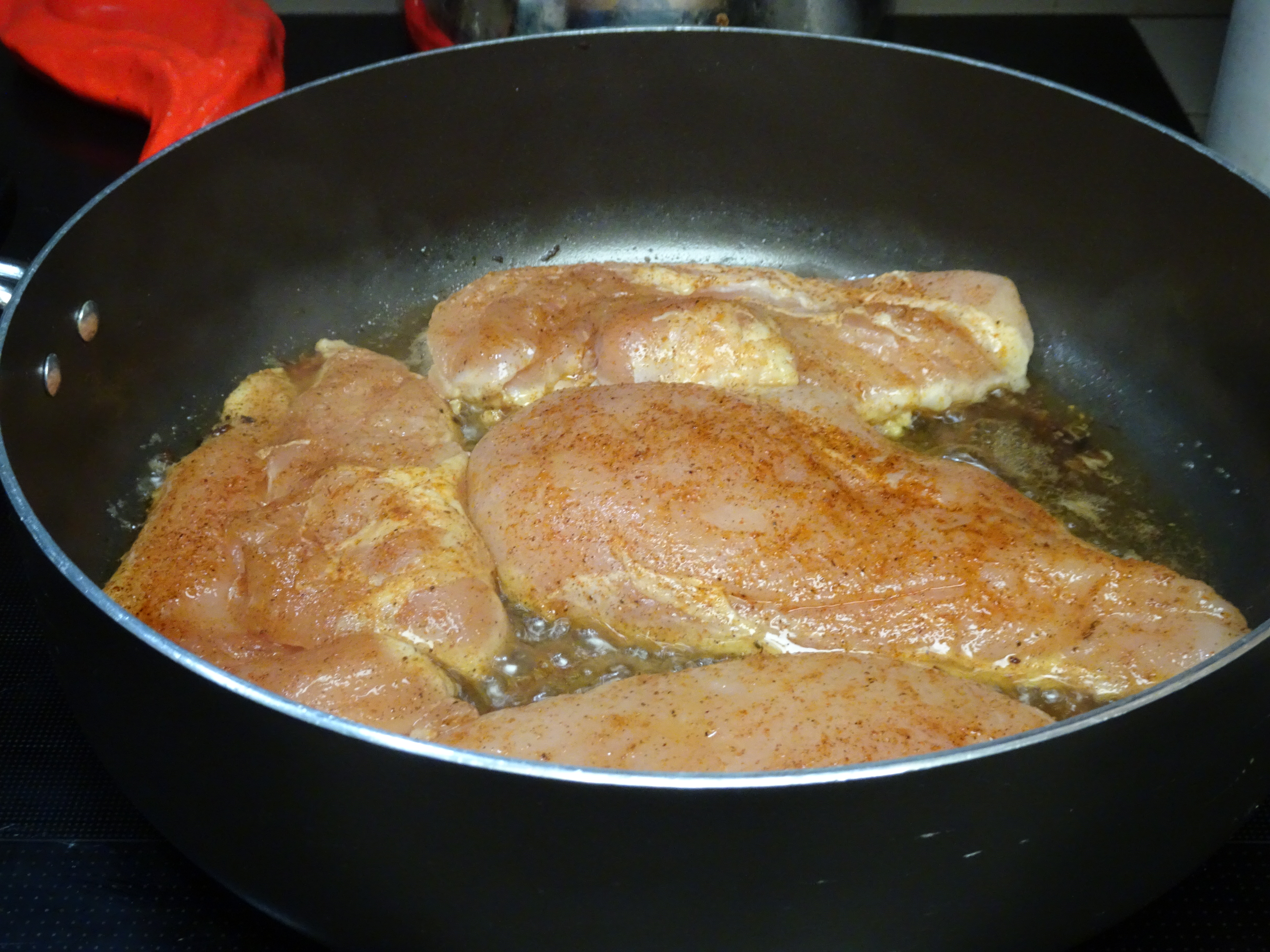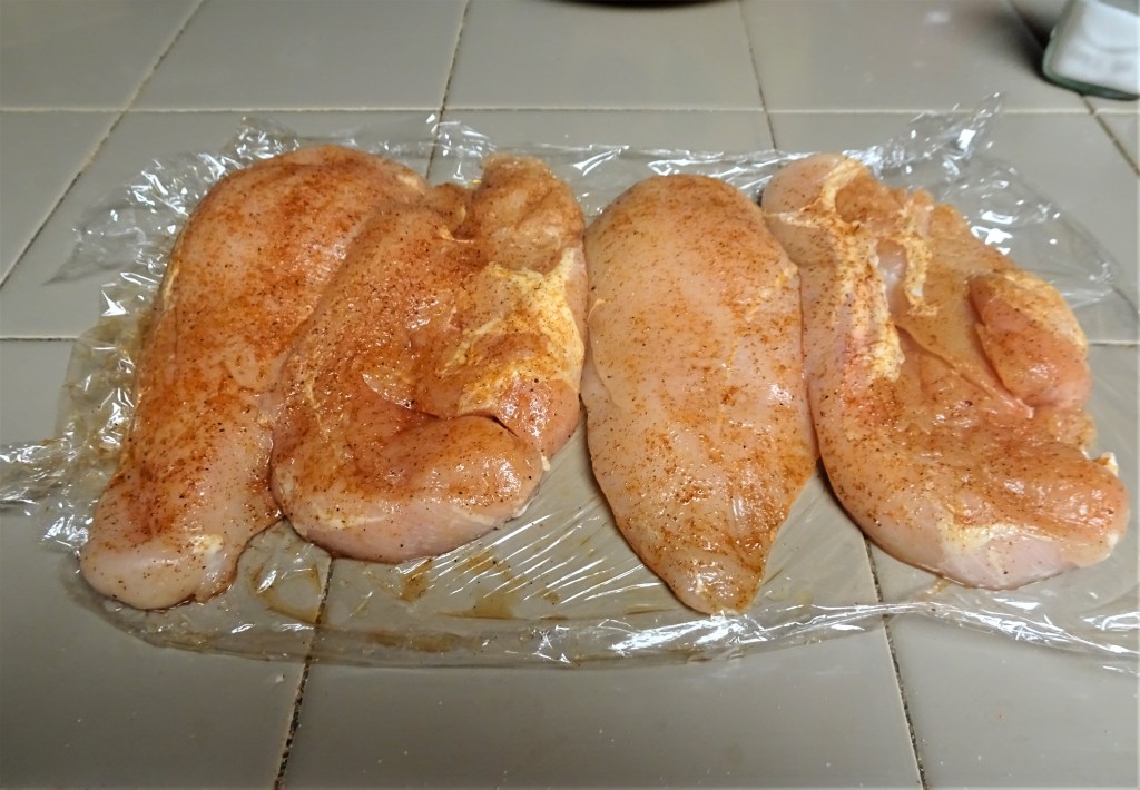 Cut chicken lengthwise to create two even thinner breasts from each larger breast. Shake Creole seasonings and a pinch of cayenne onto both sides of chicken. Wrap in plastic, and refrigerate chicken for at least 30 minutes to an hour.