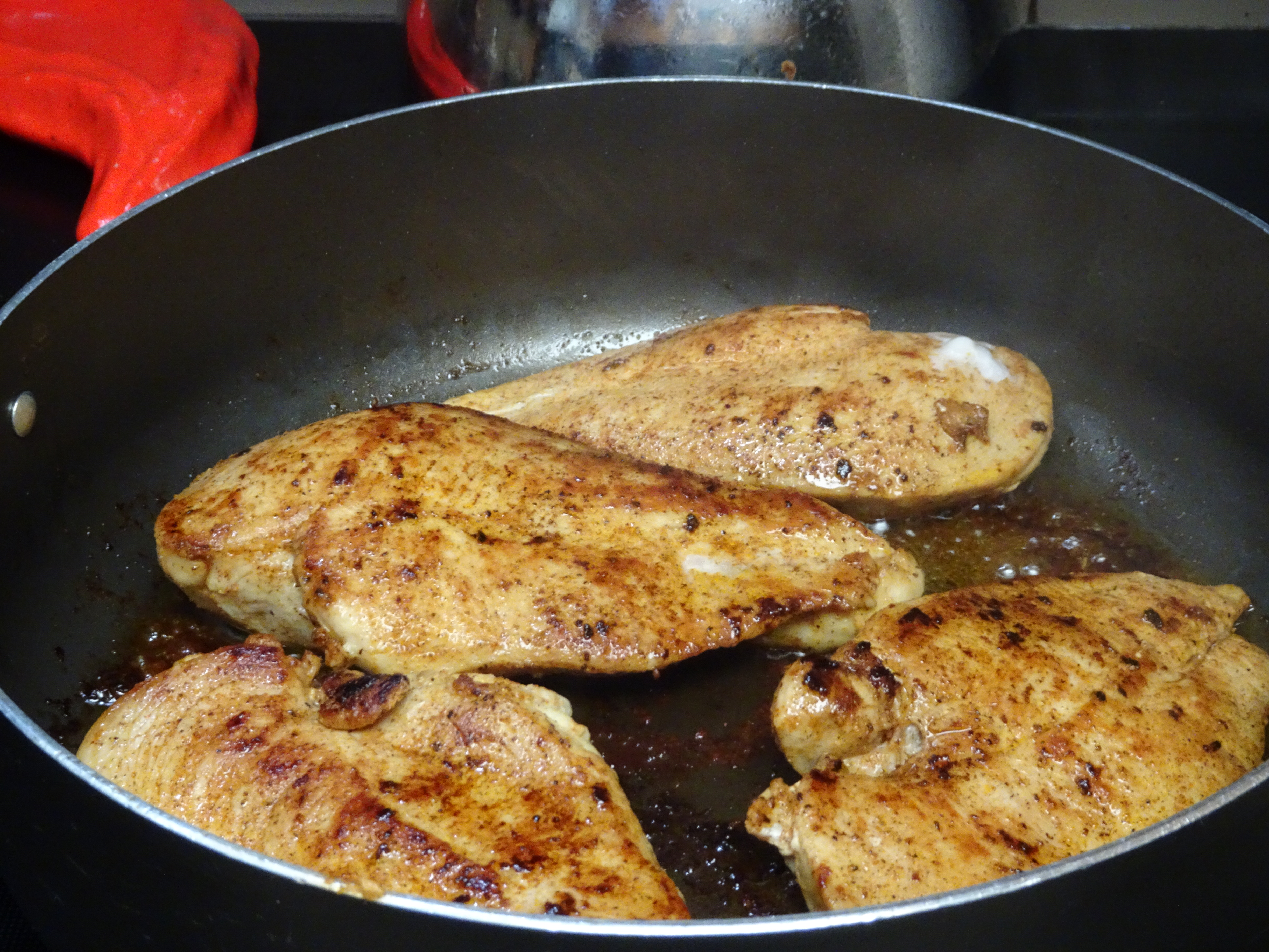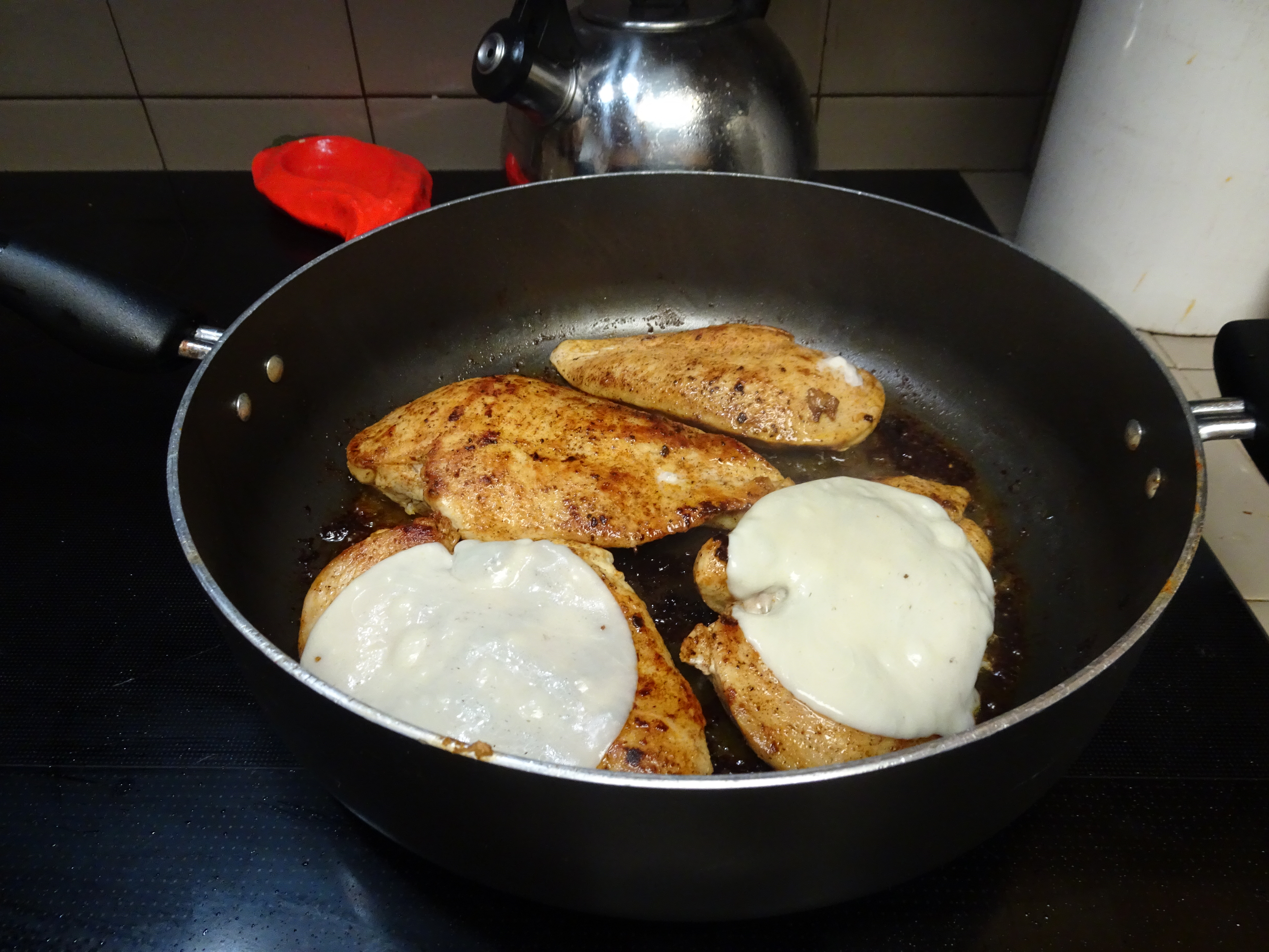 Pan fry chicken in the same pan used for the bacon. Cook about 5 minutes per side or until cooked through. Top breasts with smoked provolone cheese. Cover with lid, let cheese melt.