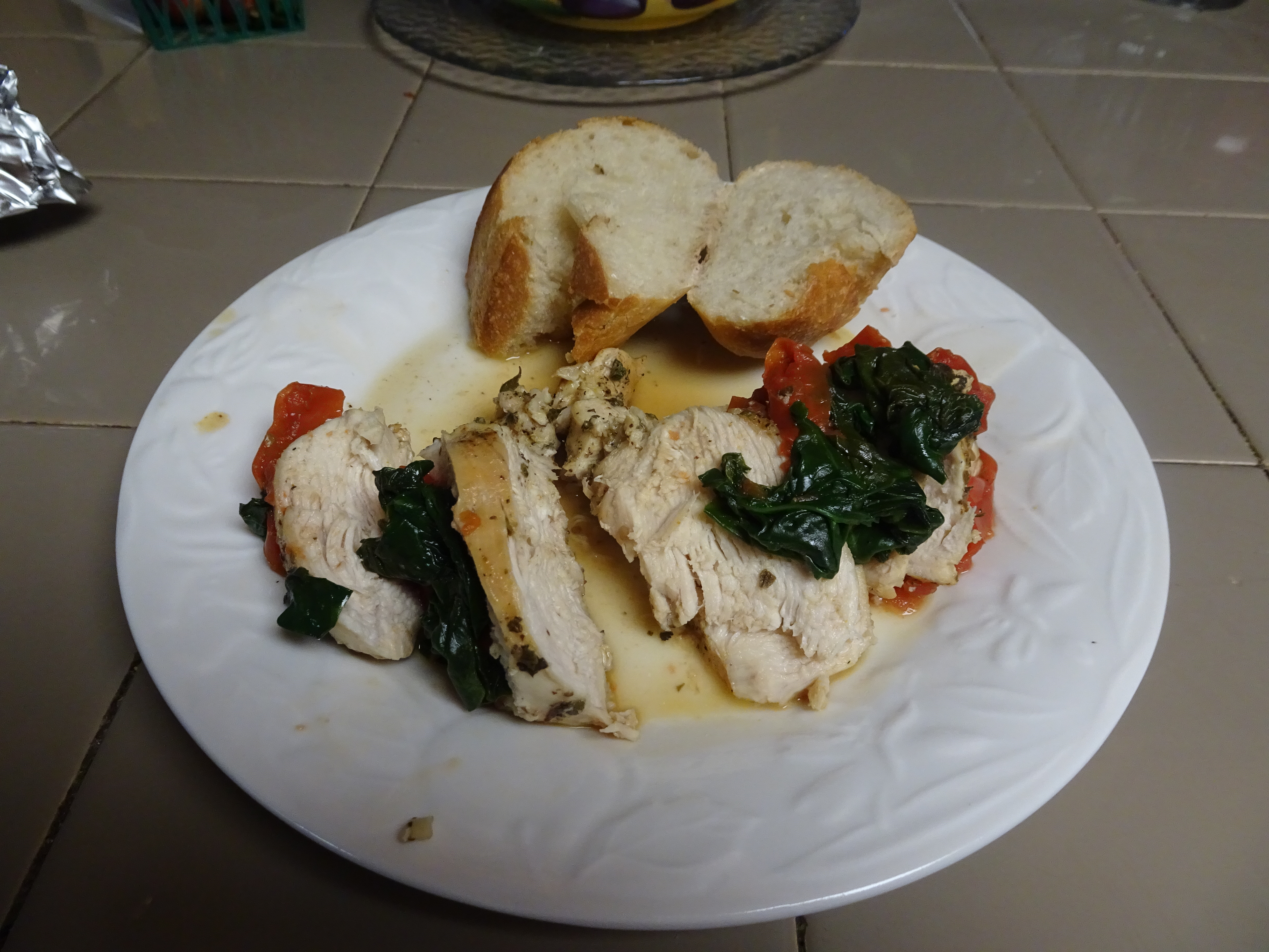 To serve, slice breast, fan out. Top with tomatoes and spinach. Drizzle a little pan drippings over the breast.