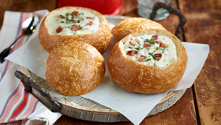 With a sharp knife, carefully carve a circle about 2/3 of the way up the side of each bread boule, making sure not to cut through the bottom. Cutting in towards the center, remove the top from each one. With fingers, scoop out some of the inner bread to form a bowl.